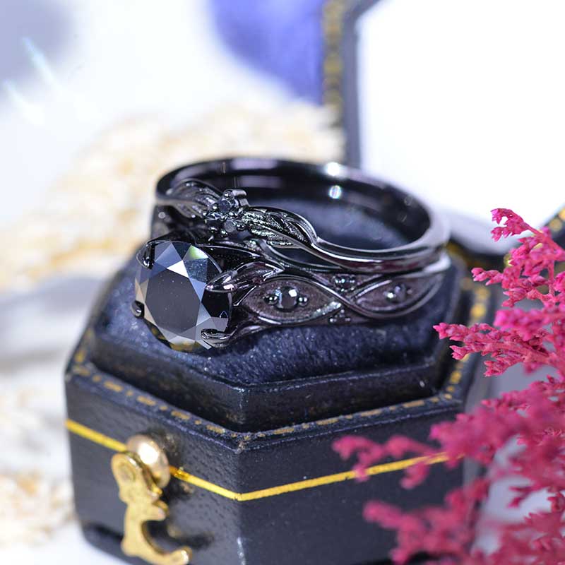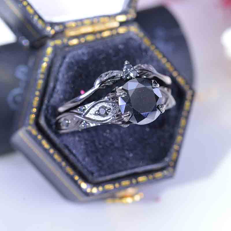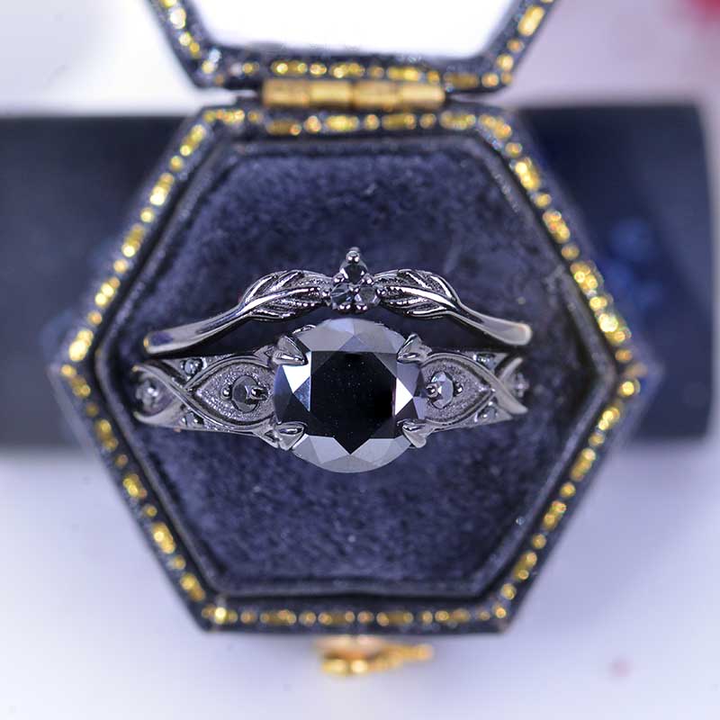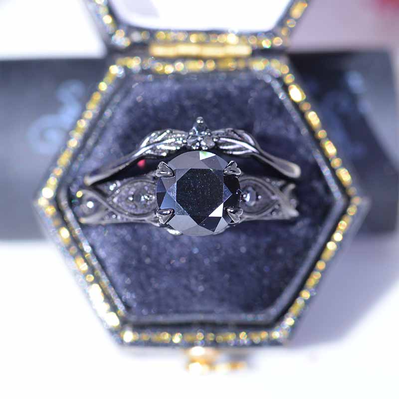 2 Carat Moissanite Center Stone - Round 8 mm, Black - Color Ex-Cut, Ex-Polish, VG-Symmetry) and Black Moissanite Accents 0.18 CTW with 14K Black Gold.
