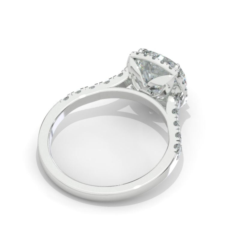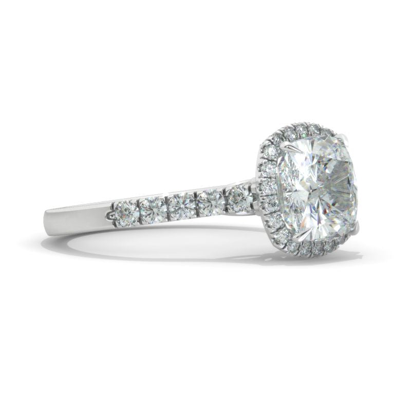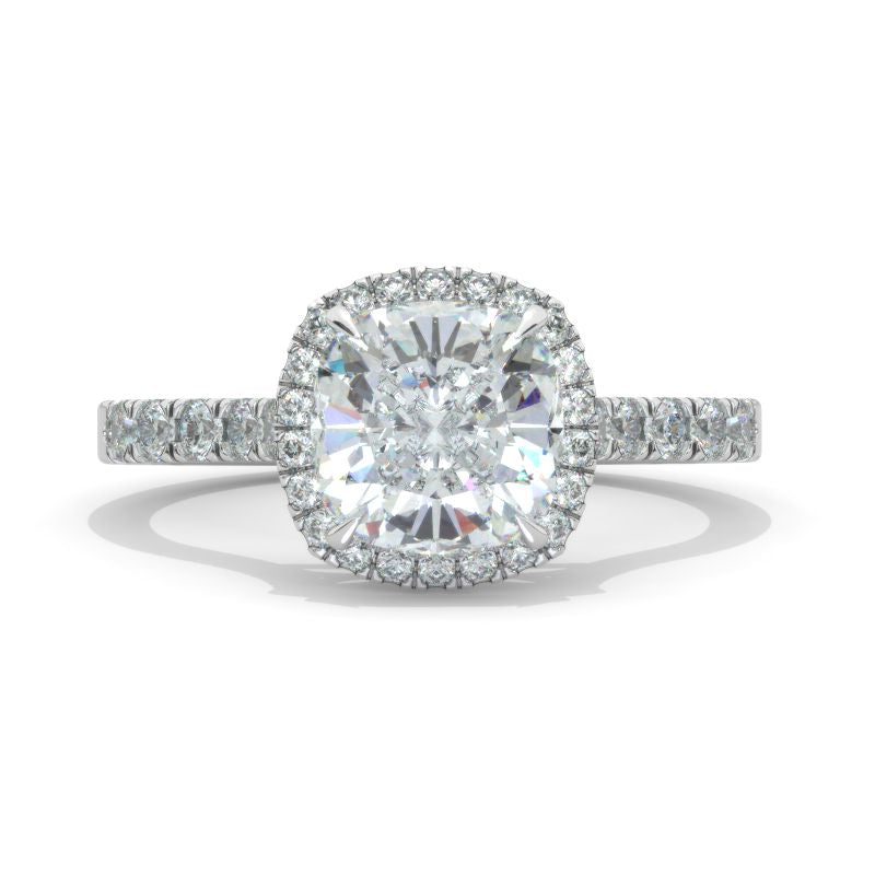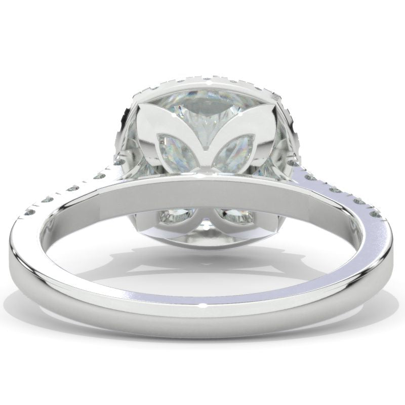 The default design option features Approximately 2+ Carat 8x8mm Cushion Cut Flower LAB-Grown Diamond Center Stone and LAB-Grown Diamond Accents D-Colorless, VVS1-Clarity, VG-Cut, Ex-Polish, VG-Symmetry