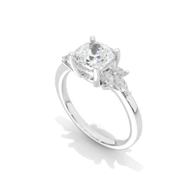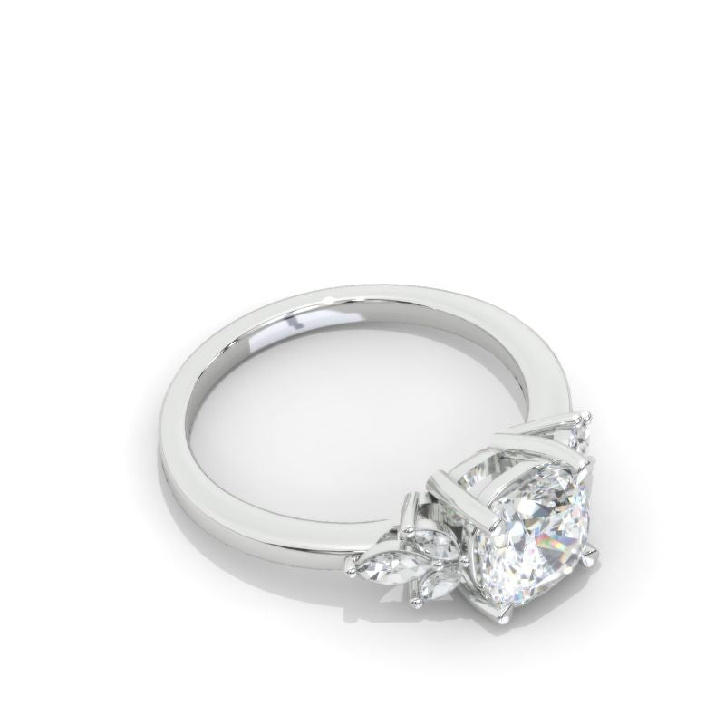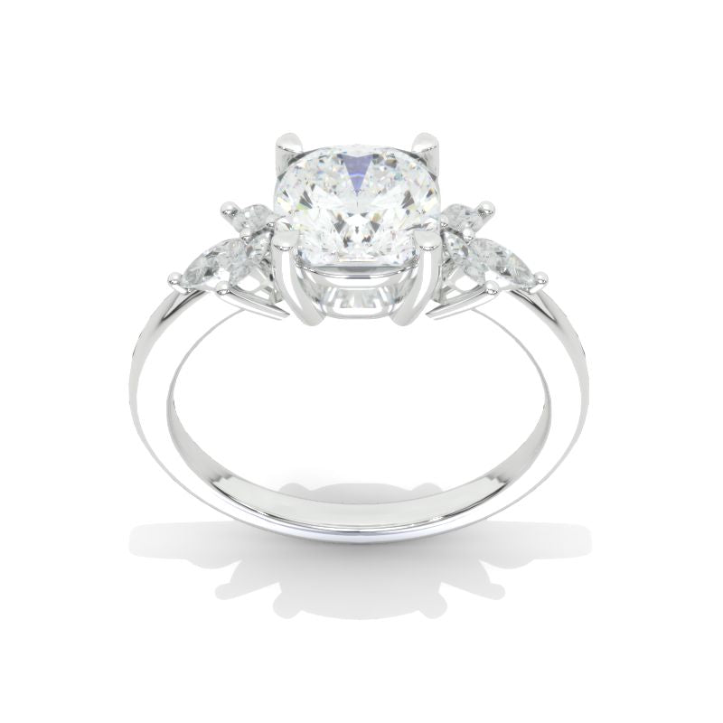 The default design option features Approximately 2+ Carat 7x7mm Cushion Cut LAB-Grown Diamond Center Stone D-Colorless, VVS1-Clarity, VG-Cut, Ex-Polish, VG-Symmetry set with D- Colorless LAB-Grown Diamond Accent Stones