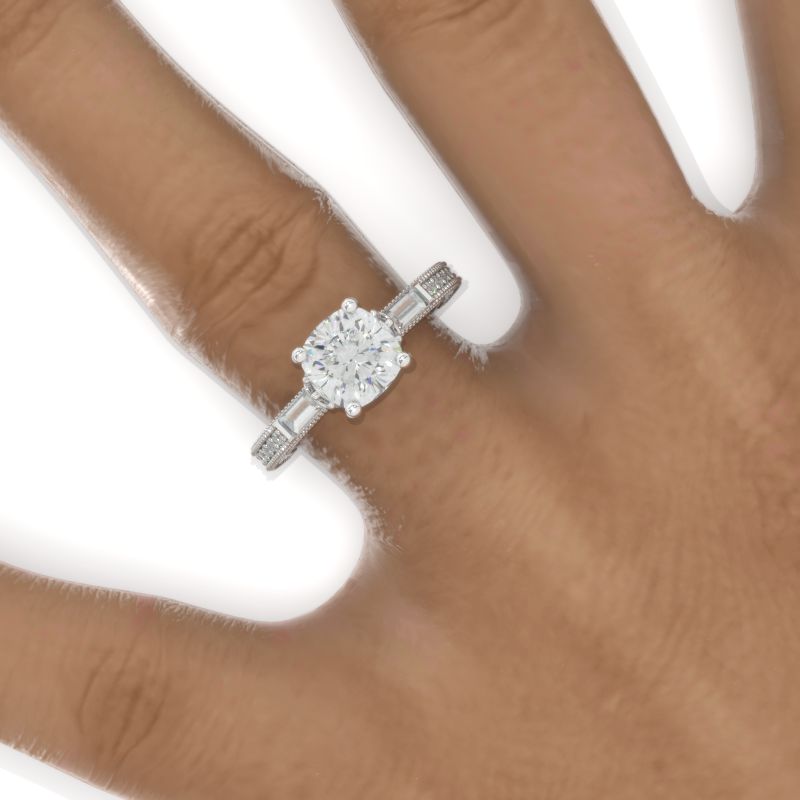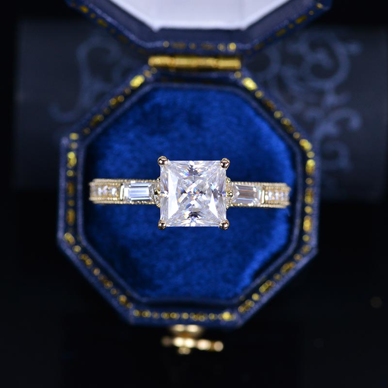 The default design option features 2 Carat 7x7mm Princess Cut Giliarto Moissanite Center Stone and Moissanite Accents D-Colorless, VVS1-Clarity, VG-Cut, Ex-Polish, VG-Symmetry