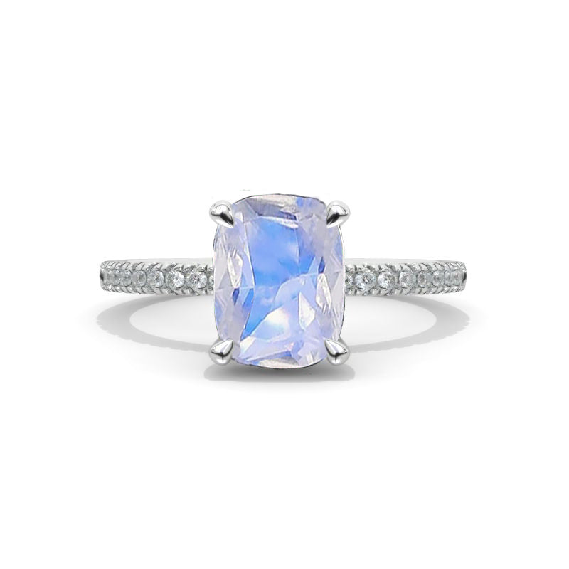 The default design option features approximately 2 Carat Genuine Natural Moonstone Cushion 9x7mm VG-Cut,Ex-Polish, VG-Symmetry Center Stone