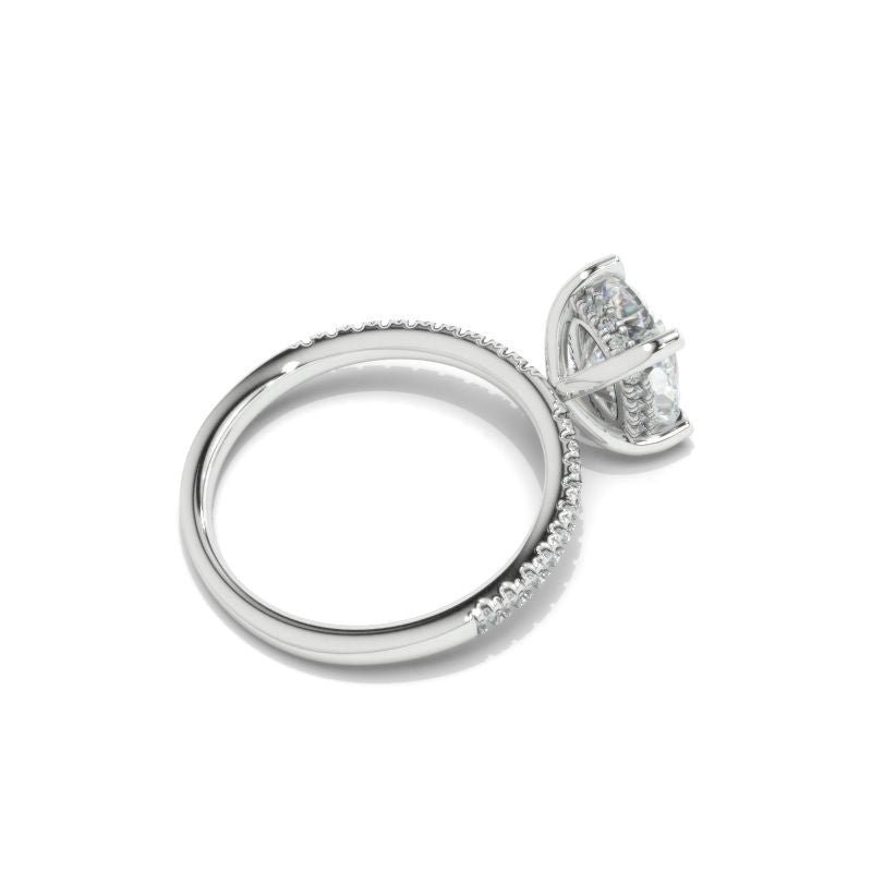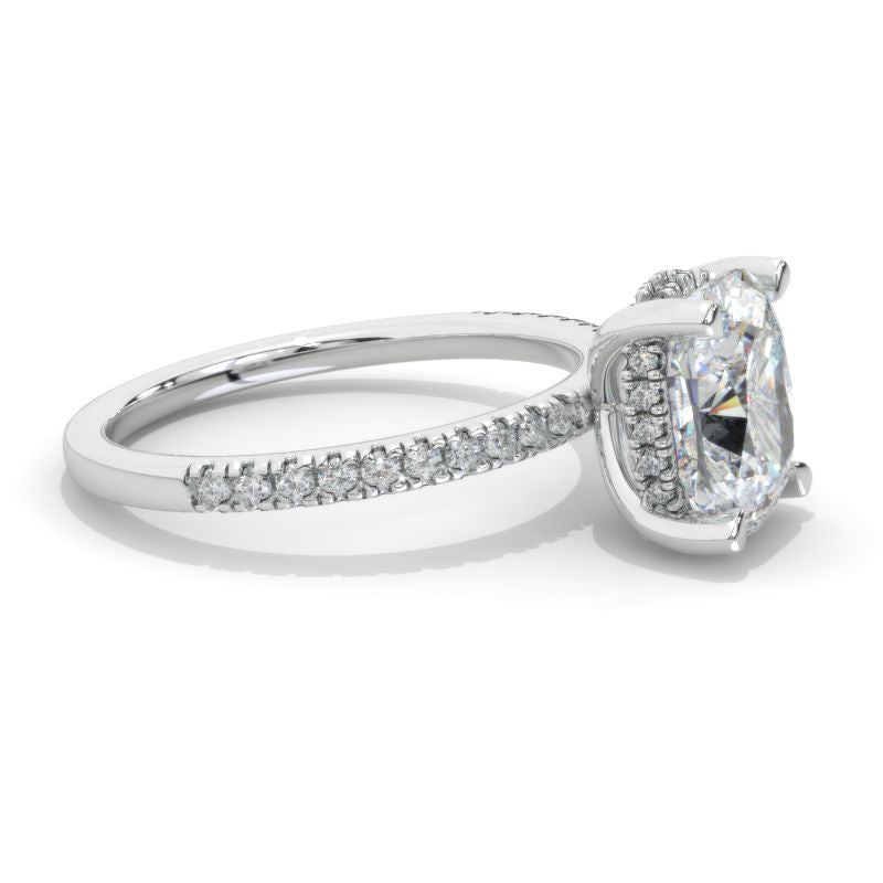 The default design option features approximately 2 Carat Giliarto Moissanite Cushion 9x7mm D-Colorless, VVS1-Clarity,VG-Cut,Ex-Polish, VG-Symmetry Center Stone