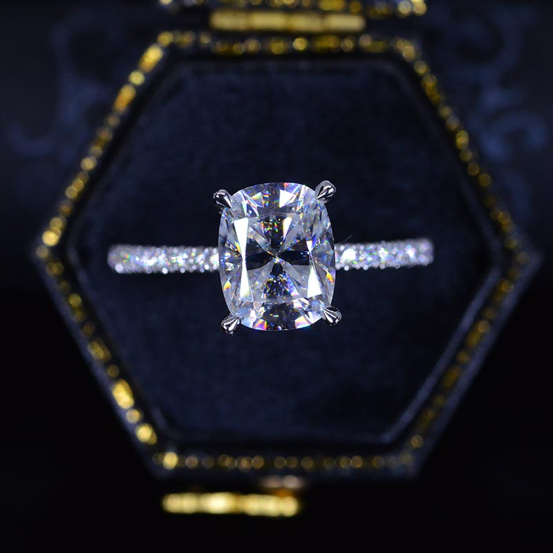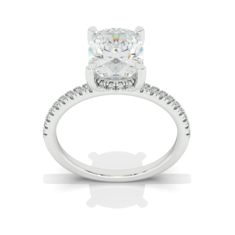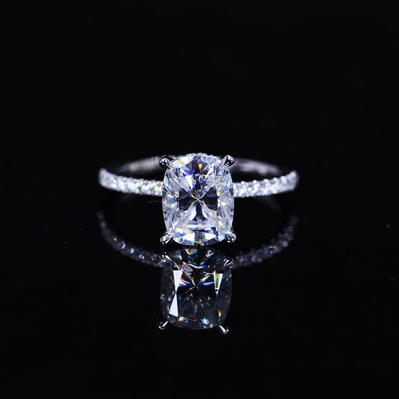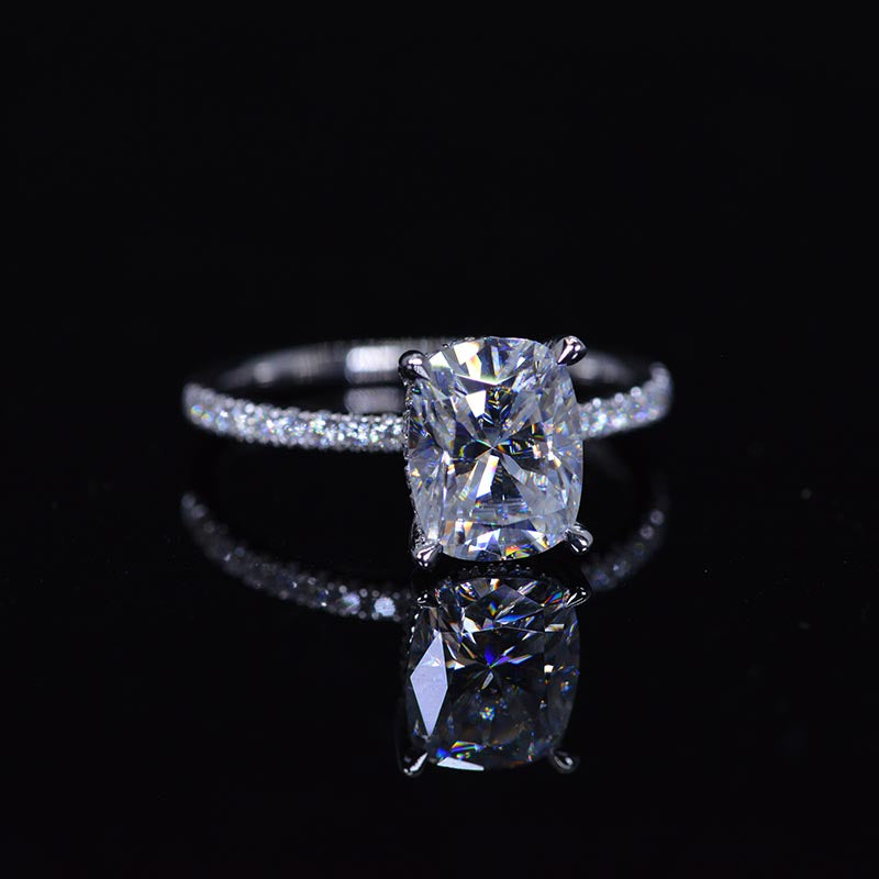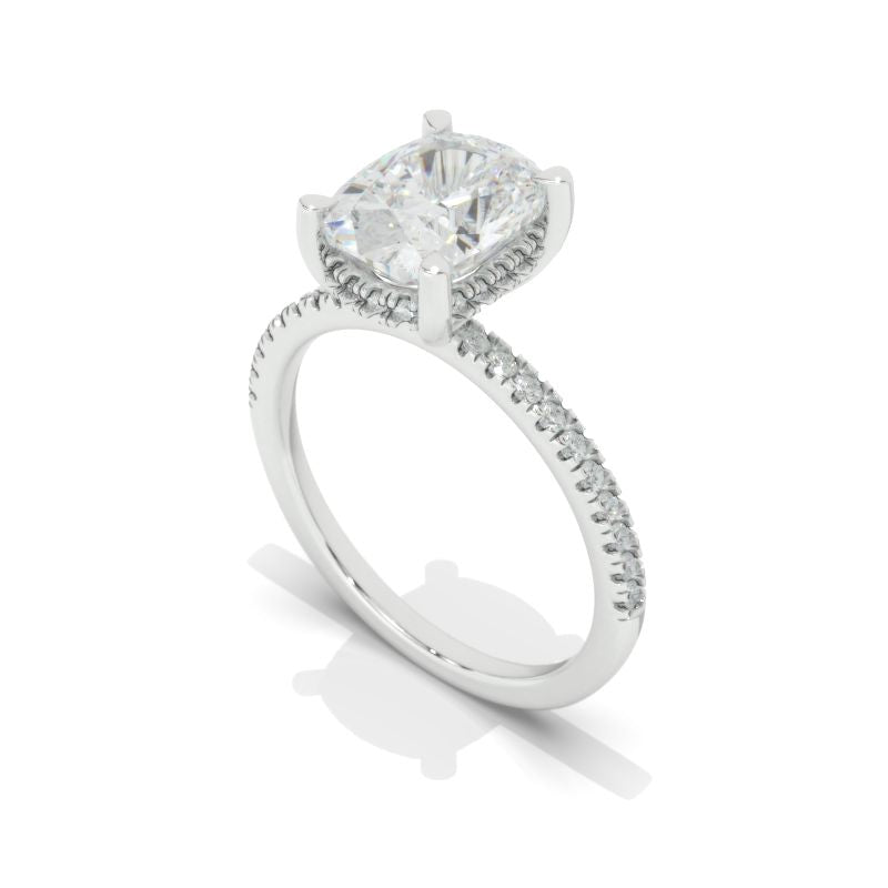 The default design option features approximately 2 Carat Giliarto Moissanite Cushion 9x7mm D-Colorless, VVS1-Clarity,VG-Cut,Ex-Polish, VG-Symmetry Center Stone