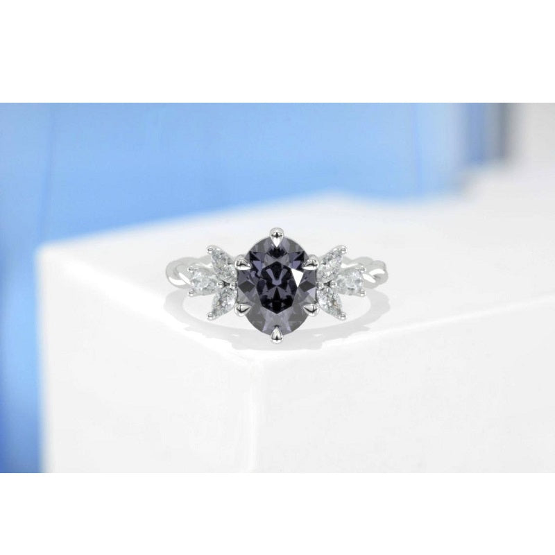 The default design option features 9x7mm Oval Center LAB-Grown Diamond Dark Gray Blue,D-Colorless VS1-Clarity, VG-Cut, Ex-Polish, VG-Symmetry set with D- Colorless LAB-Grown Diamond Accent Stones