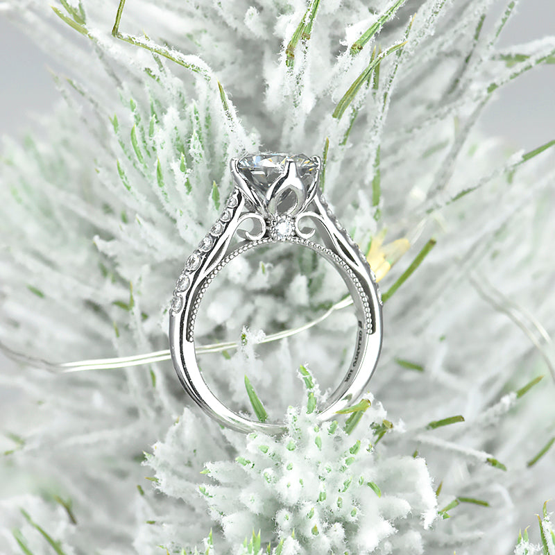 16 diamond accent stones (0.3 CTW D-Colorless, VVS1 clarity) with 14K white gold.