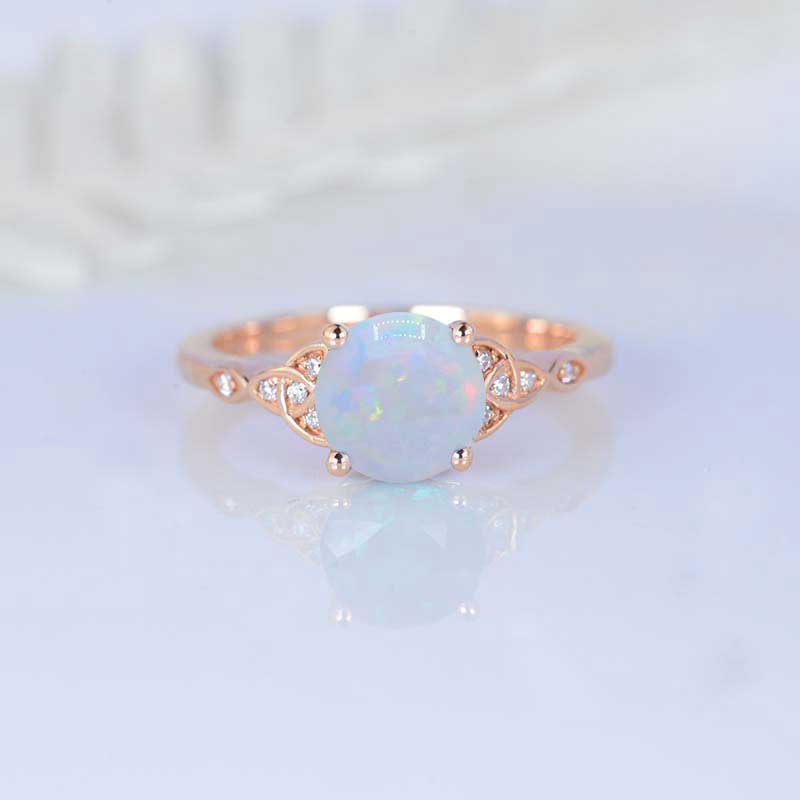 On the image featured Celtic  round Ethically LAB-Grown Genuine White Opal 8mm VVS1-Clarity,  VG-Symmetry  with - 0.1 CTW  accent stones 14K White Gold  Ring.