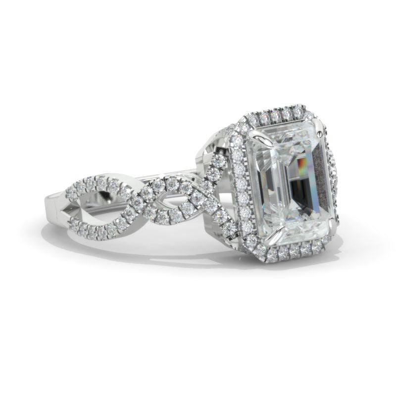 The default design option features 2 Carat 8x6mm Emerald Cut Giliarto Moissanite Center Stone set with 1.2 CTW Moissanite Accent Stone: D-Colorless, VVS1-Clarity, VG-Cut, Ex-Polish, VG-Symmetry