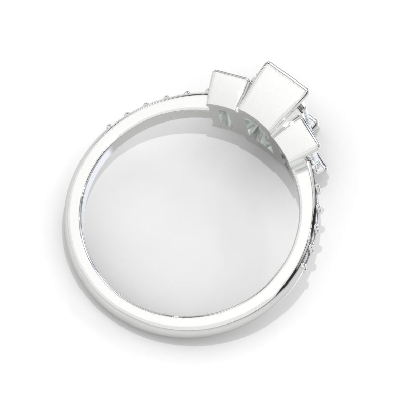 7x5mm Emerald Cut Moissanite D-Colorless, VVS1-Clarity, VG-Cut, Ex-Polish, VG-Symmetry Center Stone and Two-(D-Colorless, VVS1 clarity) Moissanite Accent Stones in 14K White Gold Ring.Â