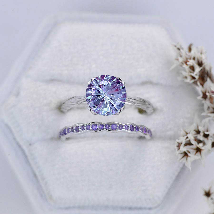 The default design option features 8mm Round Fireworks Cut Ethically Lab-Grown Alexandrite, VG-Cut, Ex-Polish, VG-Symmetry set with Amethyst Accent Stones
