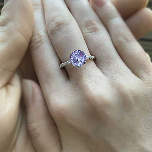 On the image featured 2 carat round Fireworks Cut Ethically Lab-Grown Alexandrite 8 mm round brilliant cut