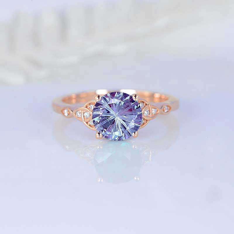 On the image featured Celtic round Fireworks Cut Ethically Lab-Grown Alexandrite 8mm  VG-Symmetry  with - 0.1 CTW  accent stones 14K White Gold  Ring.