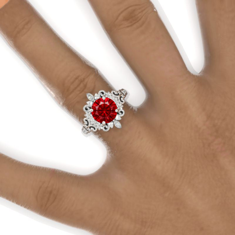 2 Carat Flowers Halo Vintage Style Ruby Engagement Ring 14K White Gold - Giliarto