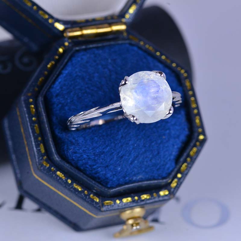 2 Carat Genuine Moonstone 14K White Gold Engagement. Eternity Ring. Opal Leaf Floral Ring Design