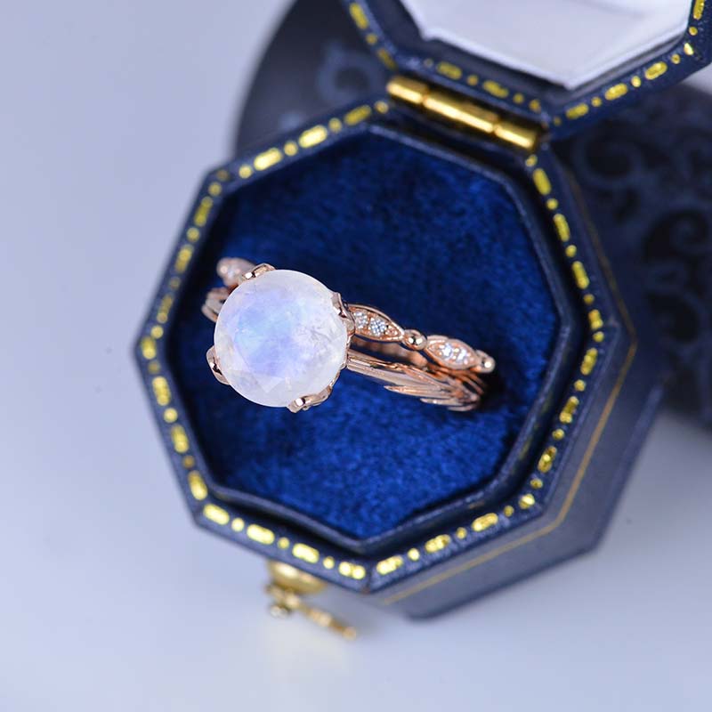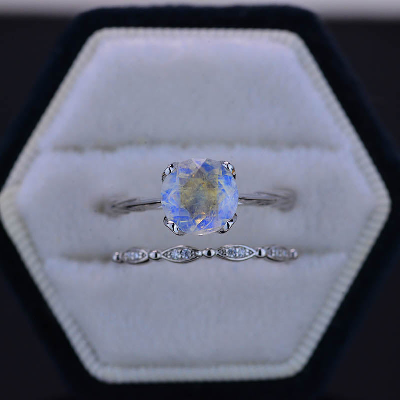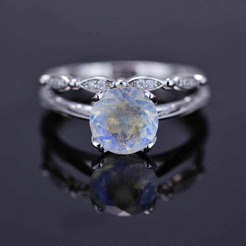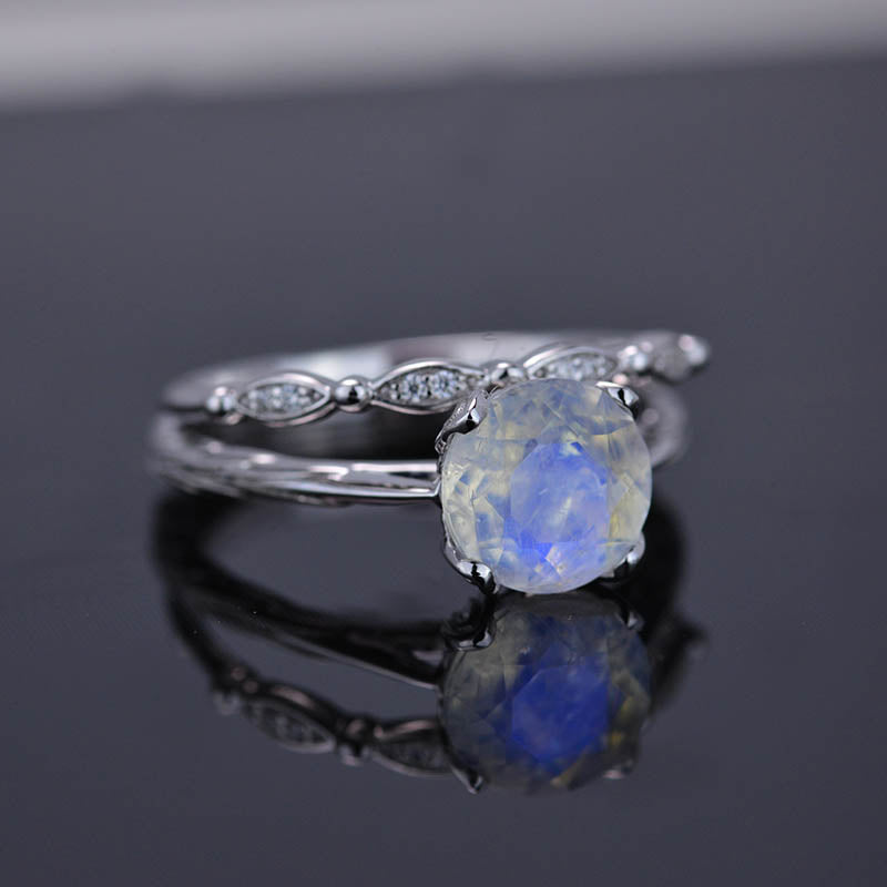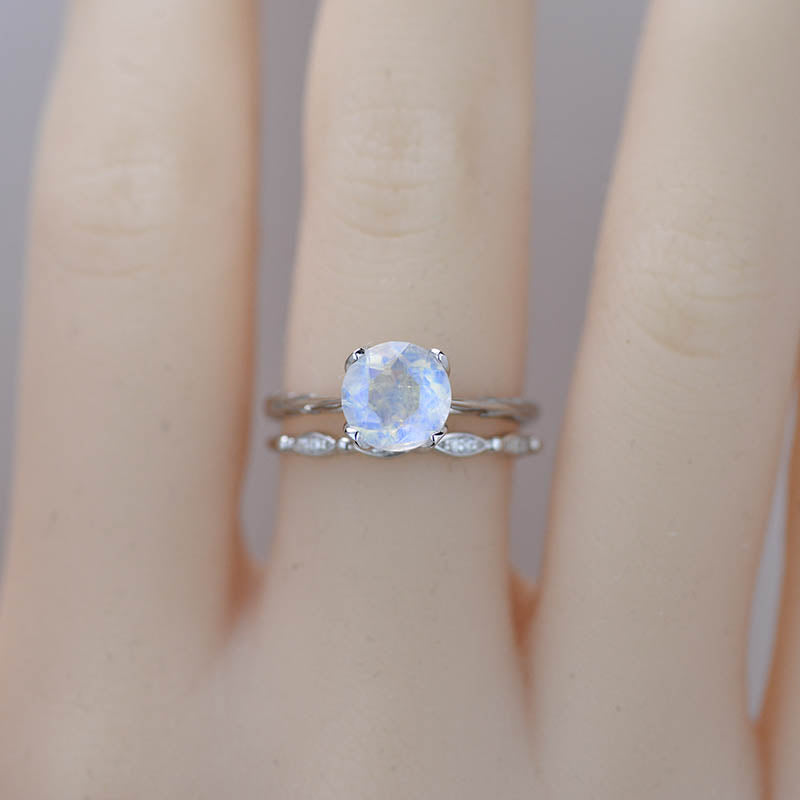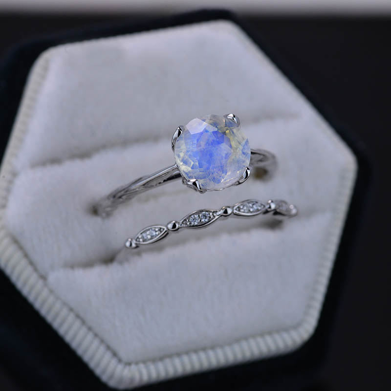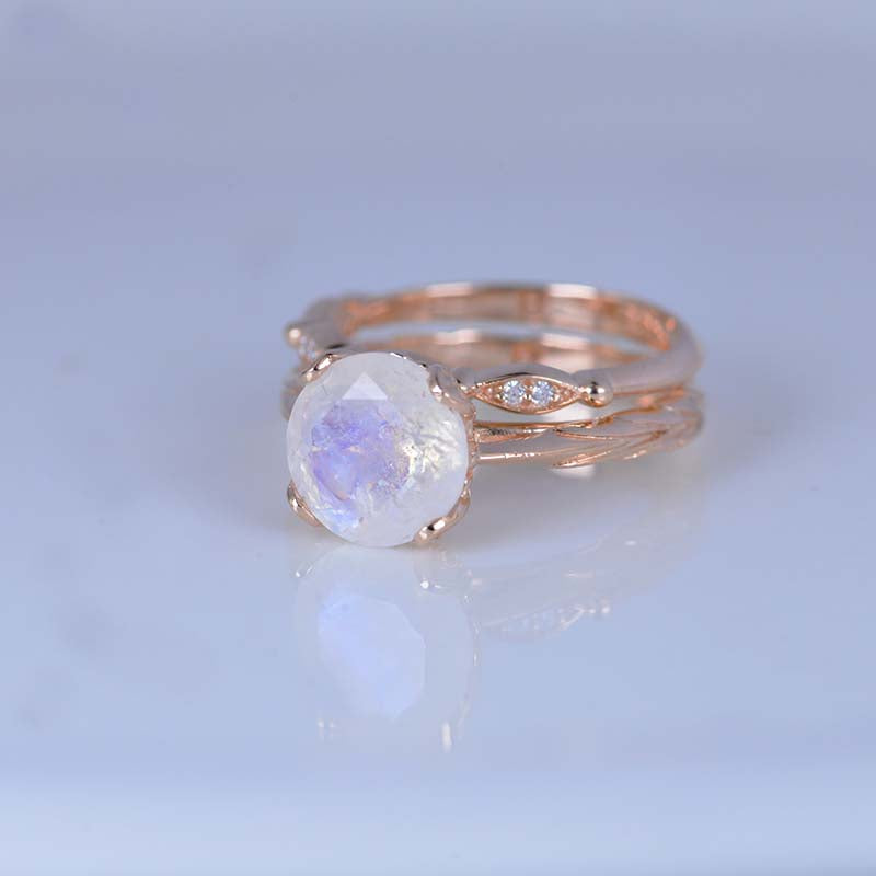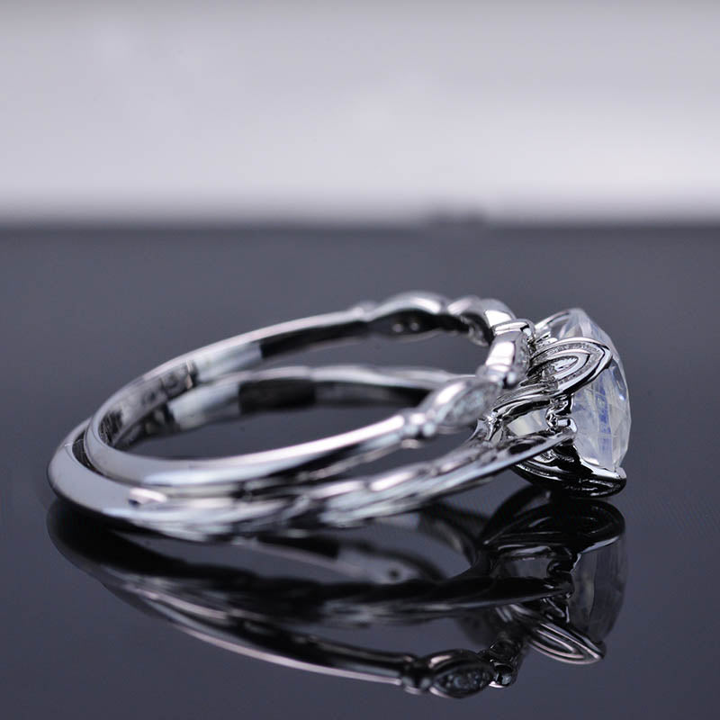 2 Carat Genuine Moonstone 14K White Gold Engagement. Eternity Ring. Set of Two Rings. Opal Leaf Floral Ring Design, Two Ring Set