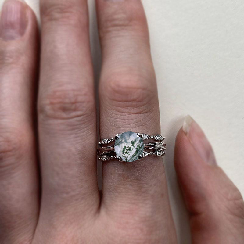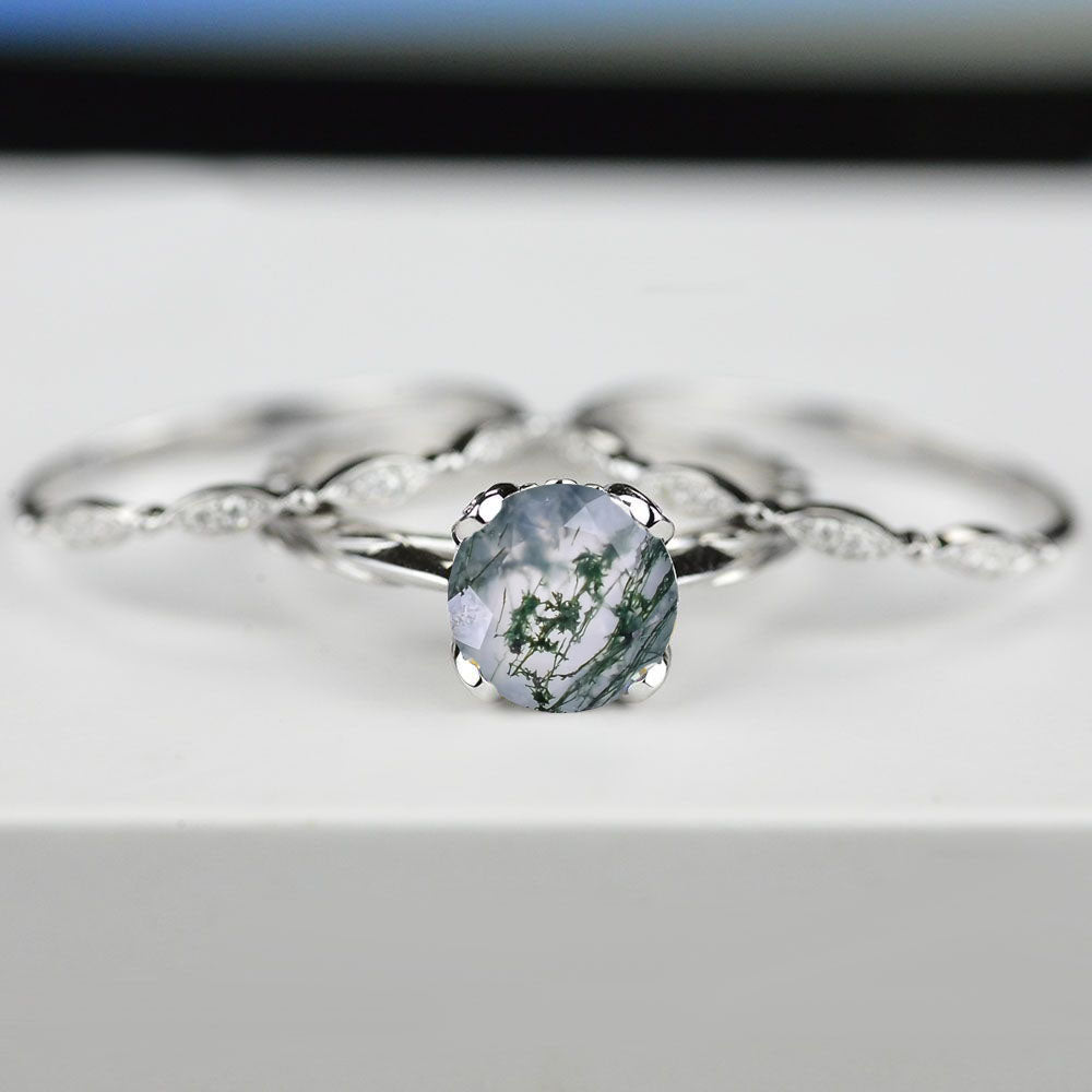 2 Carat Genuine Moss Agate Engagement Eternity Three Rings Set - Giliarto