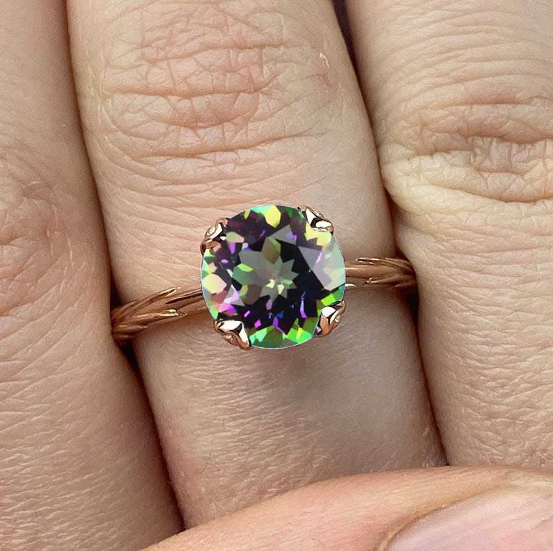 Certified 2 Carat Genuine Naturae Mystic Topaz Center Stone ( Round 8mm, VVS1-Clarity, Ex-Cut, Ex-Polish, VG-Symmetry) in 14K  White   Gold.