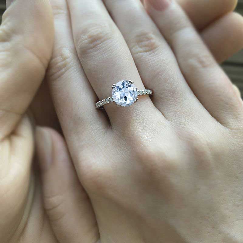 On the image featured 2.0 carat round Genuine Natural Aquamarine (VG-Symmetry) with 24 - 0.2 CTW D-Colorless, VVs1 clarity moissanite accent stones and 14K white gold ring.