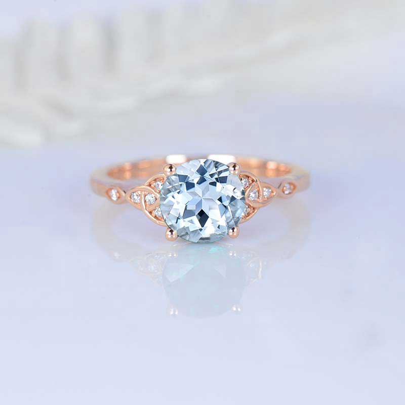 On the image featured Celtic  round Genuine Natural Aquamarine AAA+ Quality  8mm,  VG-Symmetry  with - 0.1 CTW  accent stones 14K White Gold  Ring.