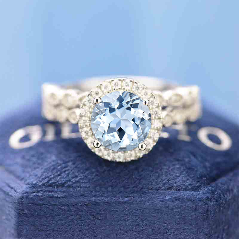 2 Carat Genuine Natural Aquamarine Halo Engagement Eternity Two Rings - Giliarto