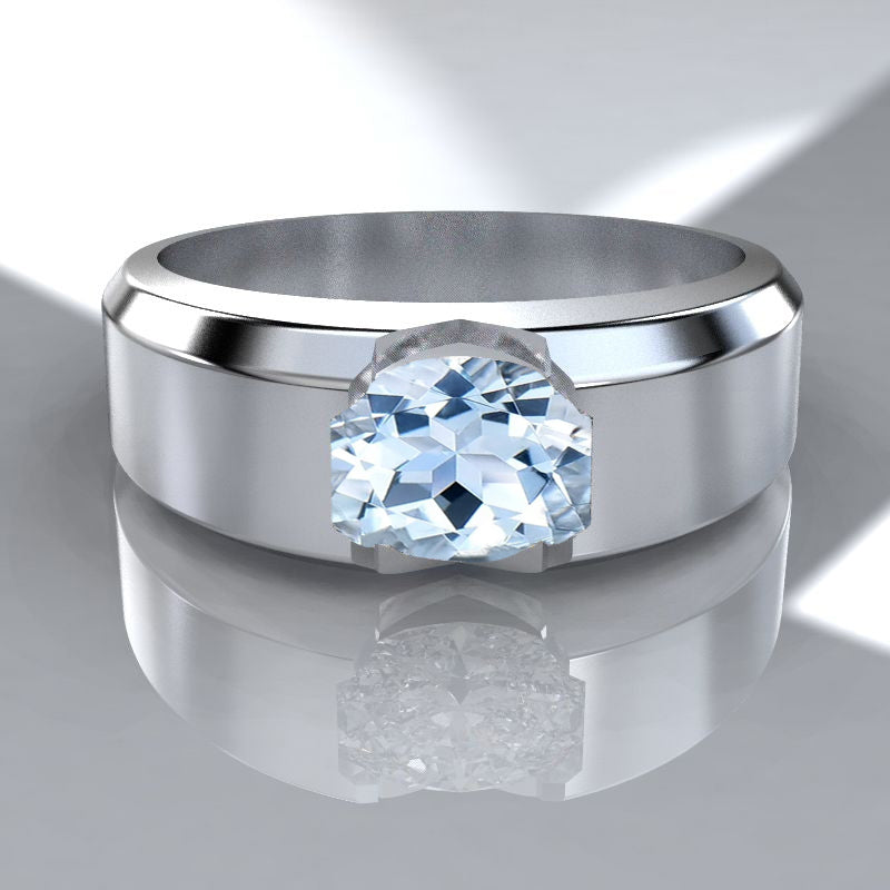 2 Carat Genuine Natural Aquamarine Oval 6x8mm, Ex-Cut, Ex-Polish, VG-Symmetry in 14K White Gold Men's Ring.