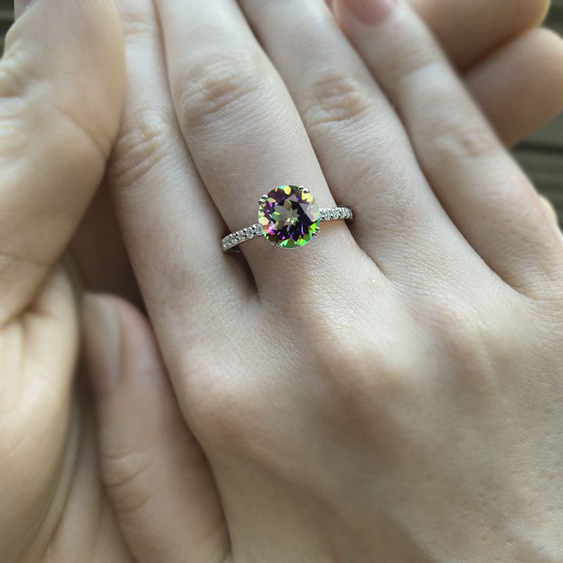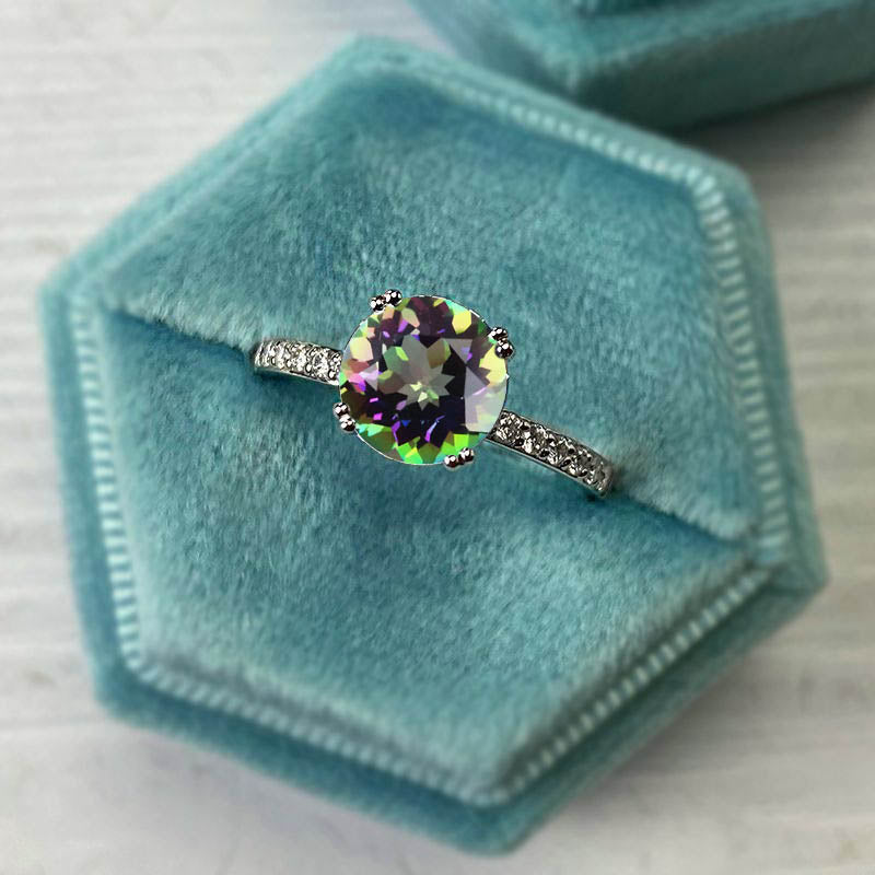 On the image featured 2.0 carat round Genuine Natural Mystic Topaz ( VVS1-Clarity, VG-Symmetry) with 24 - 0.2 CTW VVS1 clarity moissanite accent stones set in 14K white gold ring.