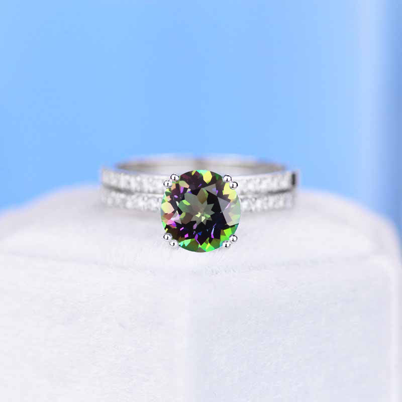 2.0 Carat Genuine Natural Mystic Topaz Center Stone (Round 8mm, VVS1-Clarity, Ex-Cut, Ex-Polish, VG-Symmetry) with Two Eternity Bands in 14K White Gold.