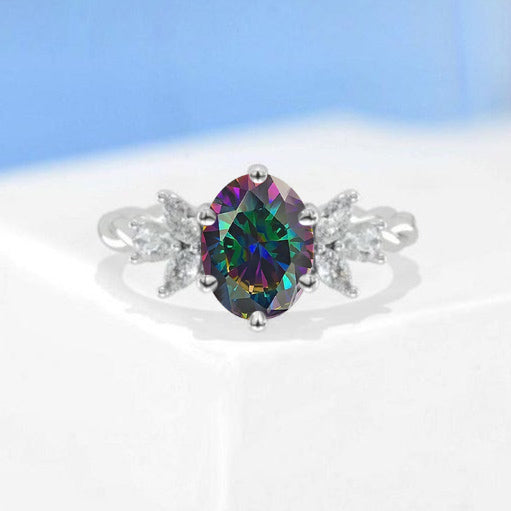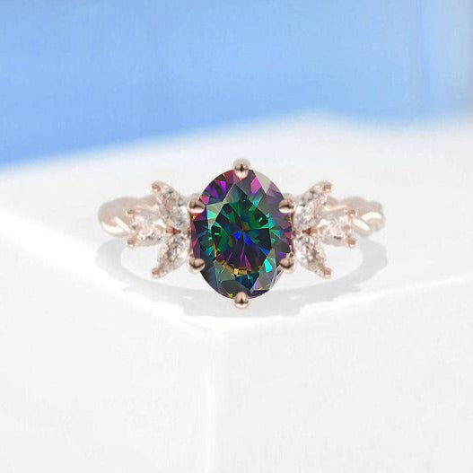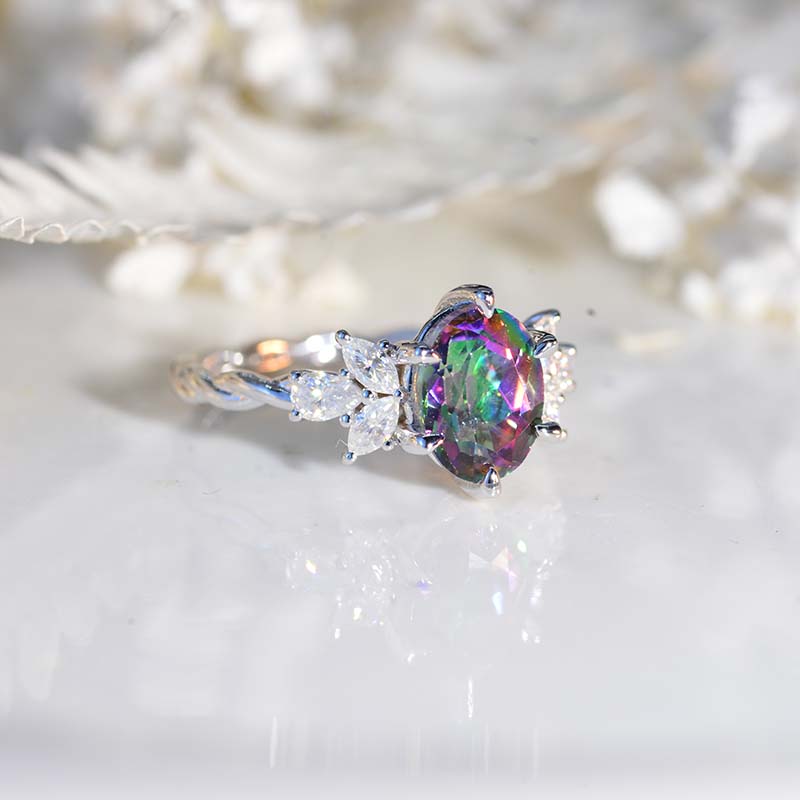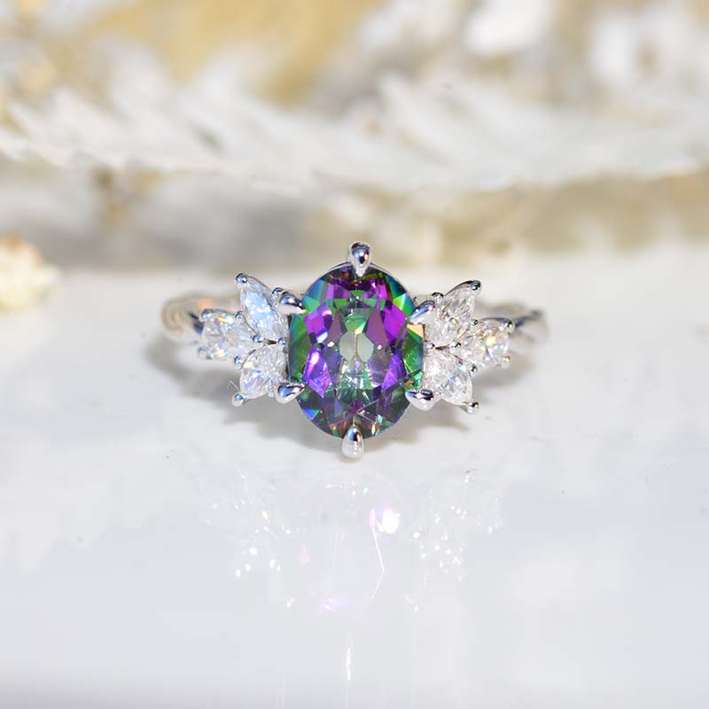 The default design option features 9x7mm Oval Center Genuine Natural Mystic Topaz Stones, VVS1-Clarity, VG-Cut, Ex-Polish, VG-Symmetry Set with D-Colorless Moissanite Accents