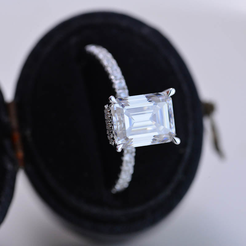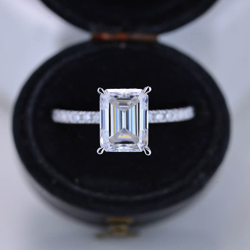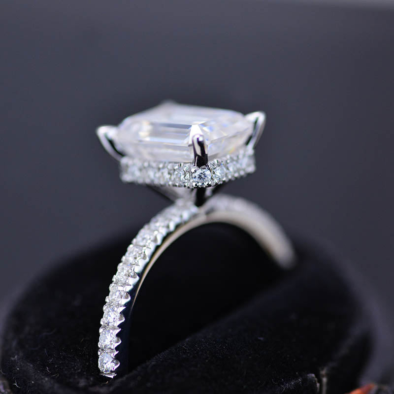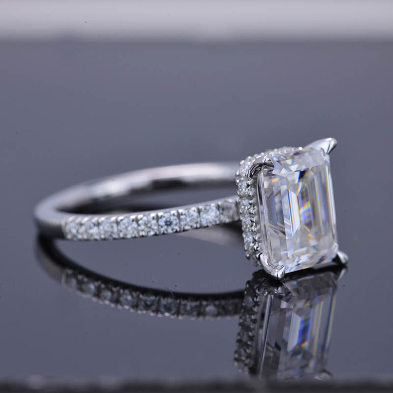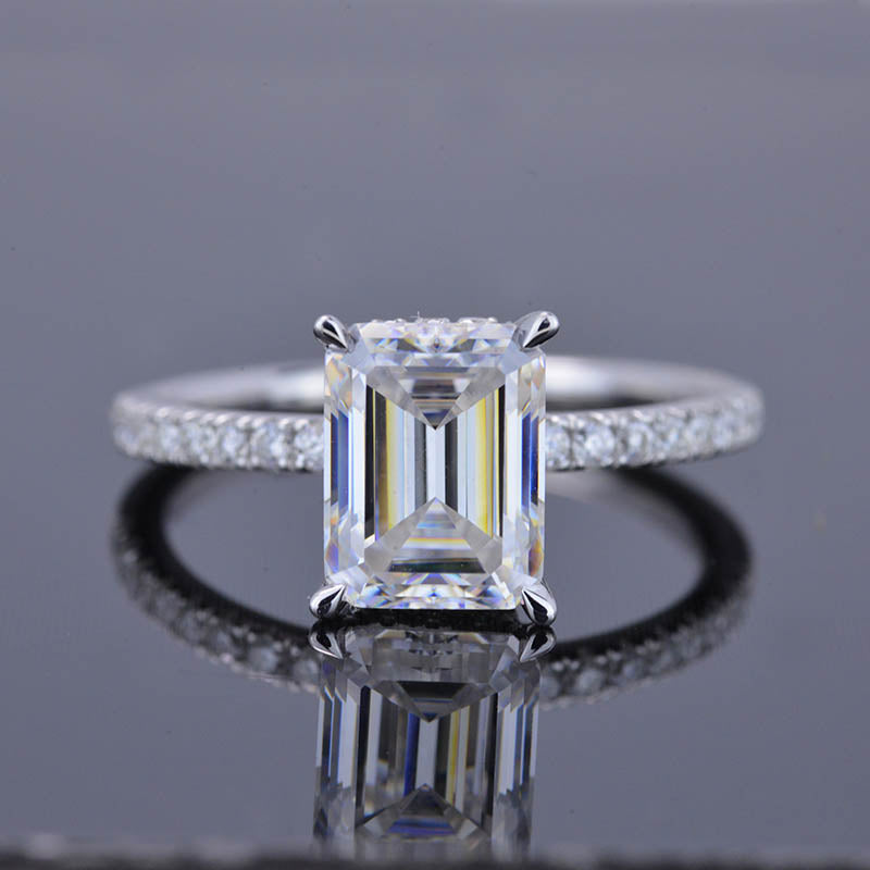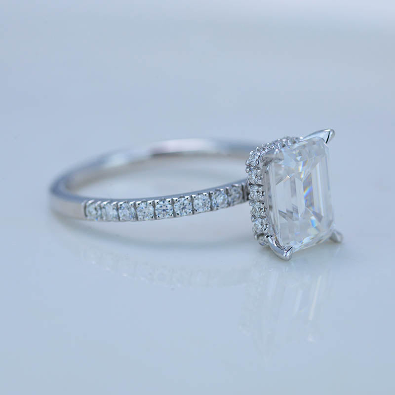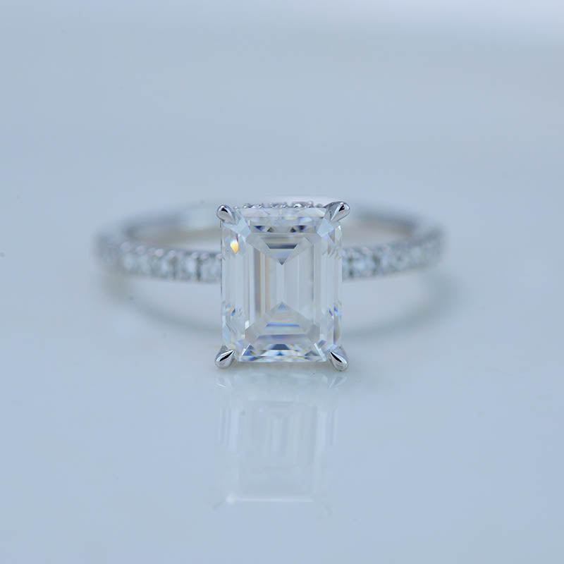 The default design option features approximately 2 Carat Giliarto Moissanite - Emerald Cut 8x6mm D-Colorless, VVS1-Clarity,VG-Cut,Ex-Polish, VG-Symmetry Center Stone