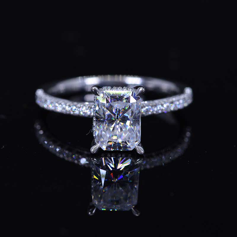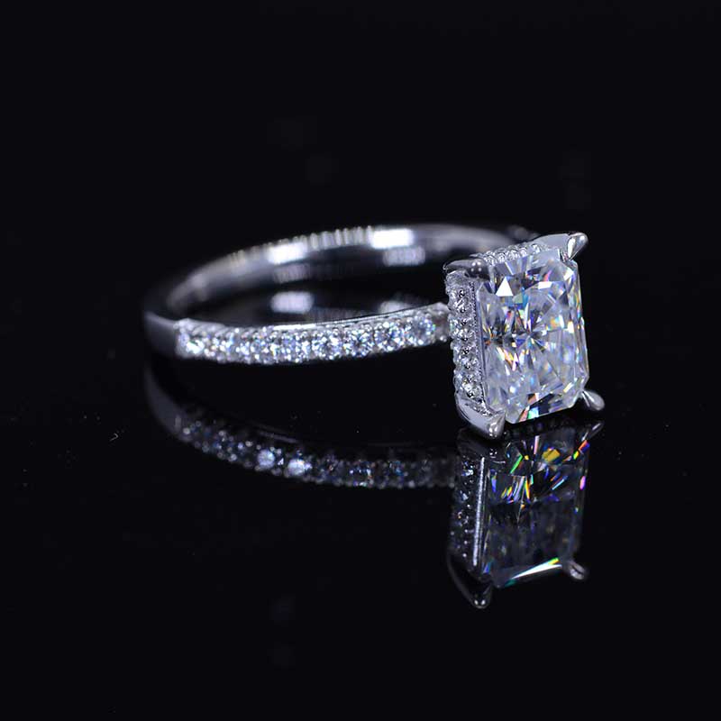 The design features approximately 2 Carat Giliarto Moissanite - Radiant Cut 8x6mm