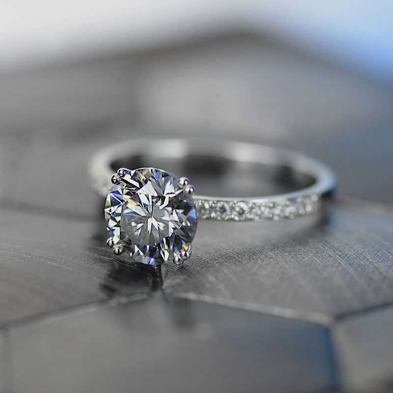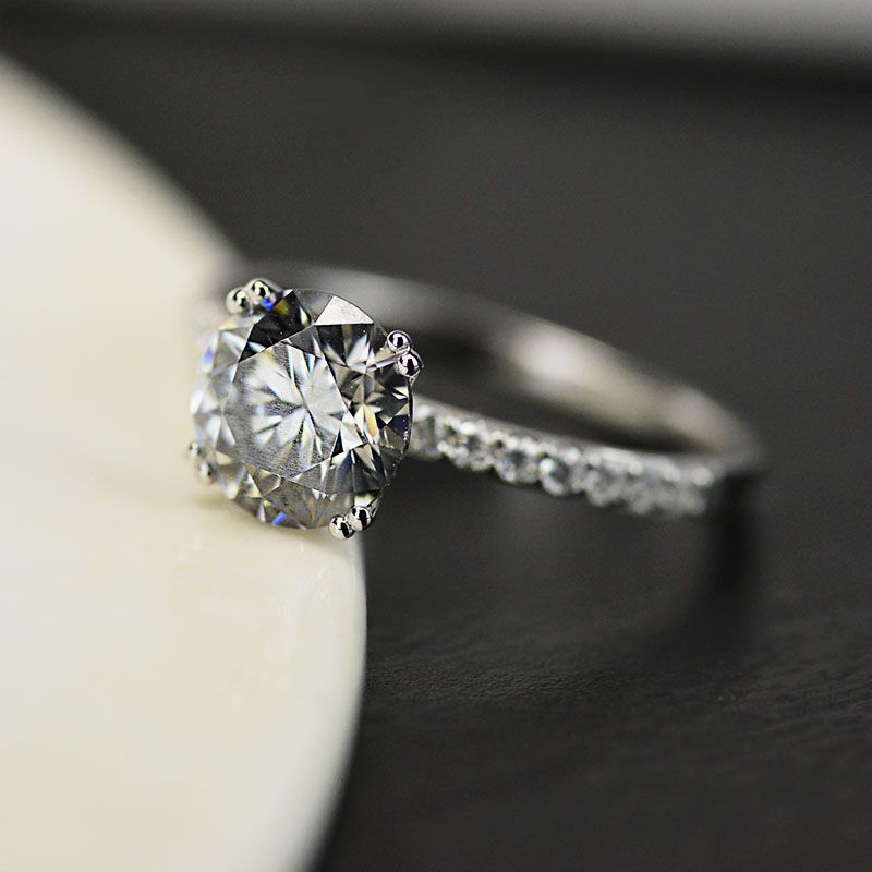 On the image featured 2.0 carat round dark grey moissanite ( VVS1-Clarity, VG-Symmetry) with 24 - 0.2 CTW D-Colorless, VVS1 clarity moissanite accent stones set in 14K white gold ring.