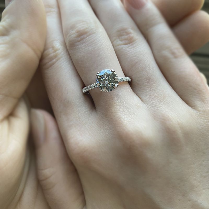 On the image featured 2.0 carat round dark grey moissanite ( VVS1-Clarity, VG-Symmetry) with 24 - 0.2 CTW D-Colorless, VVS1 clarity moissanite accent stones and 14K white gold ring.