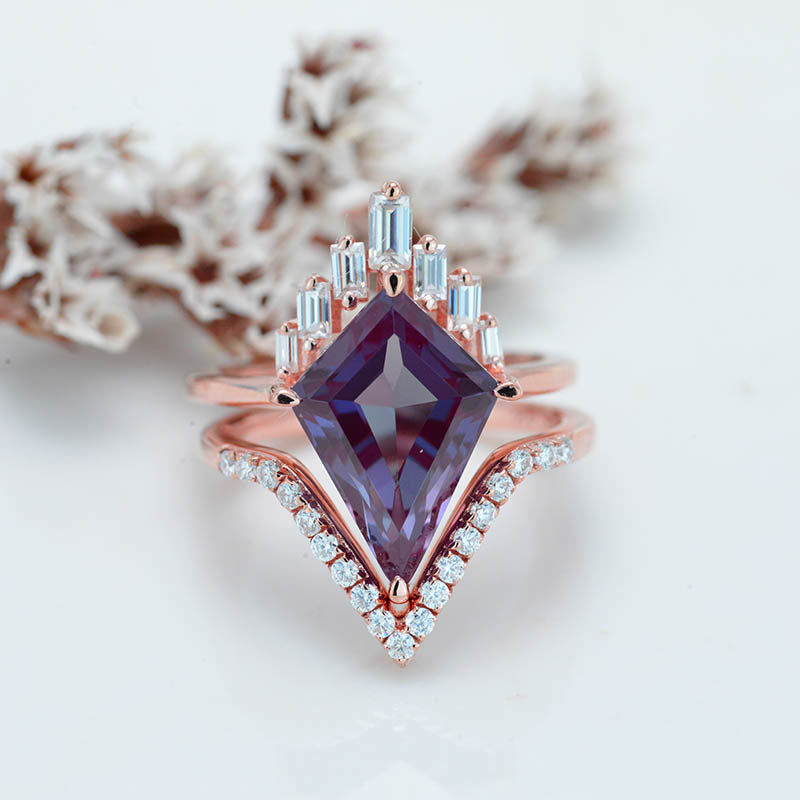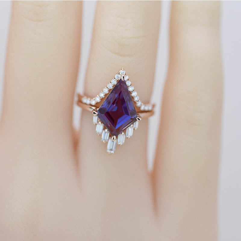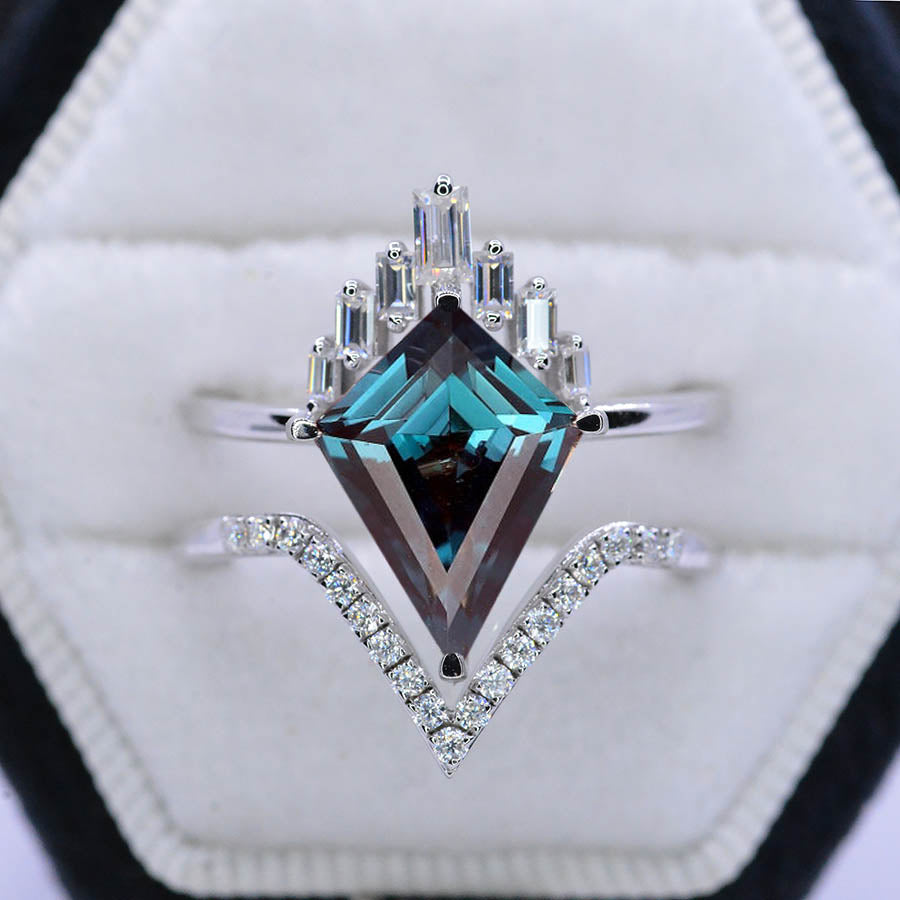 Engagement : 2 Carat Lab-Grown Alexandrite Kite 9x6 mm VVS1-Clarity, VG-Cut, Ex-Polish, VG-Symmetry Center Stone with 38 Colorless 0.5 CTW Moissanite