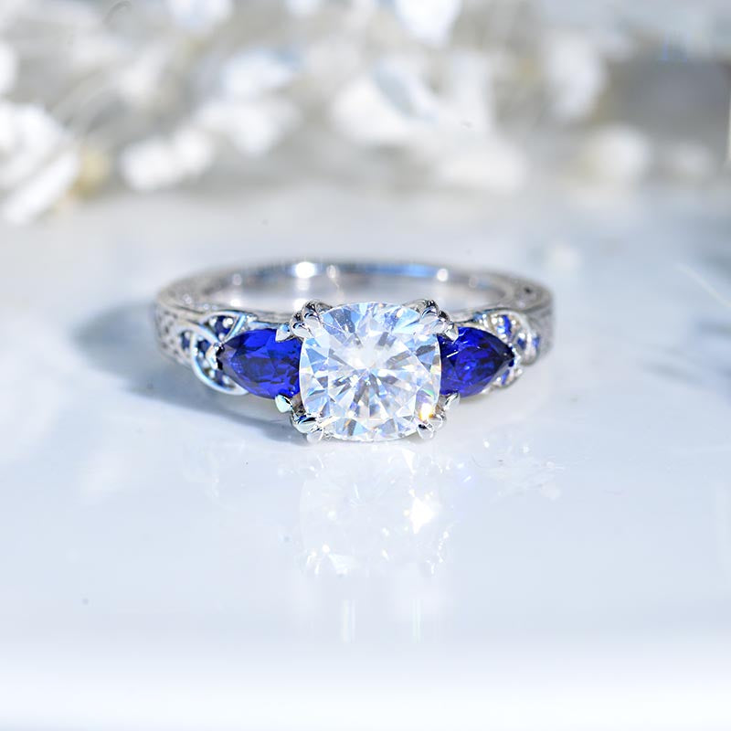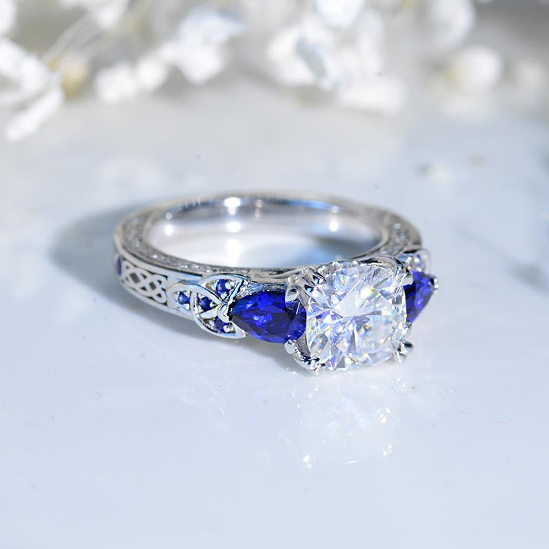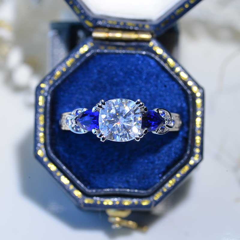 On the image featured 2+ carat Cushion Diamond  ( D-Colorless, VVS1-Clarity,  VG-Symmetry) with D Colorless,  VVS1 Clarity diamond accent stones and 14K white gold ring.