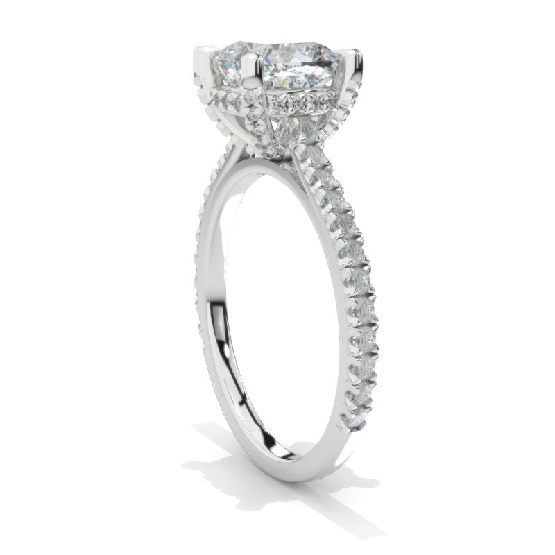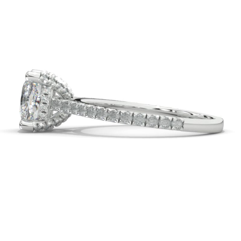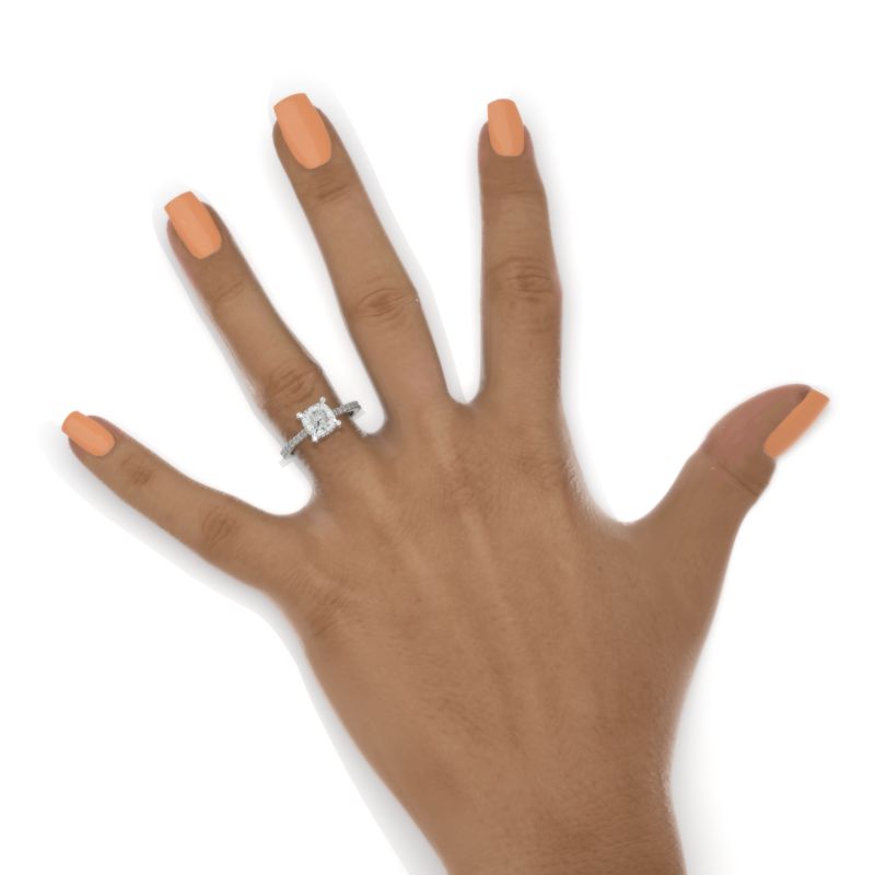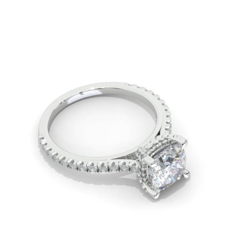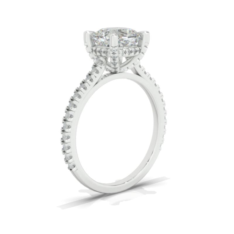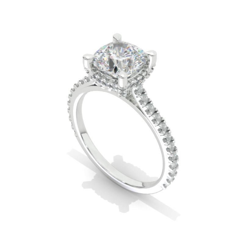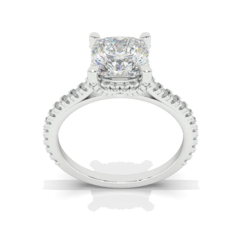 The default design option features 7x7mm LAB-Grown DiamondCushion CutĀ Center StoneĀ D-Colorless, VVS1-Clarity, VG-Cut, Ex-Polish, VG-Symmetry