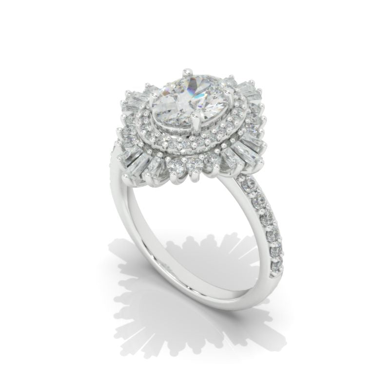 The default design option features 8x6mm Oval LAB-Grown Diamond Emerald CutĀ Center StoneĀ D-Colorless, VVS1-Clarity, VG-Cut, Ex-Polish, VG-Symmetry