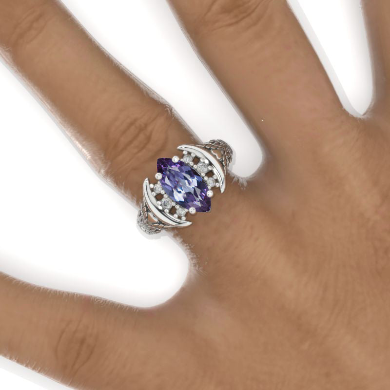 The default design option features 12x6mm Marquise Ethically Lab-Grown Alexandrite Center Stone, VG-Cut, Ex-Polish, VG-Symmetry set with D- Colorless Moissanite Accent Stones