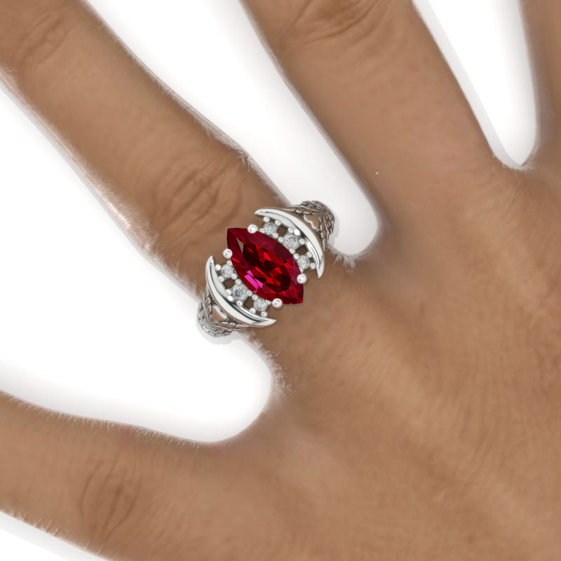 The default design option features 12x6mm Marquise Ethically Lab-Grown Ruby AAA+ Grade Center Stone, VG-Cut, Ex-Polish, VG-Symmetry set with D- Colorless Moissanite Accent Stones
