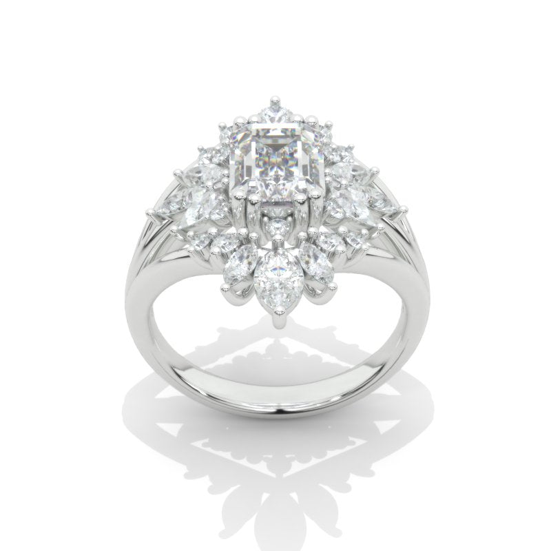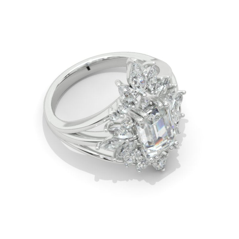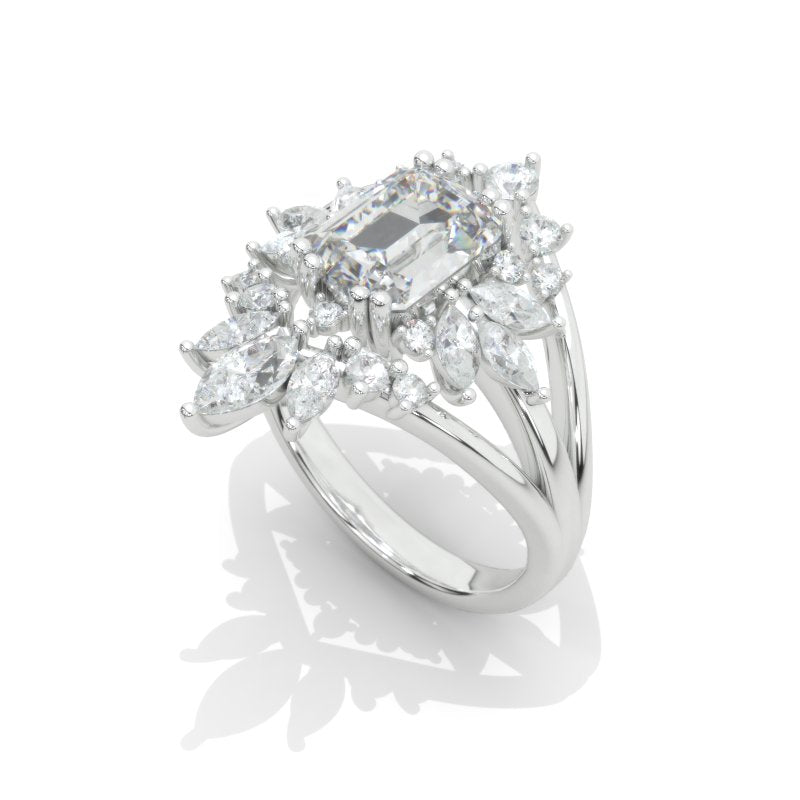 The default design option features 8x6mm Giliarto Moissanite Emerald Cut Center Stone D-Colorless, VVS1-Clarity, VG-Cut, Ex-Polish, VG-Symmetry