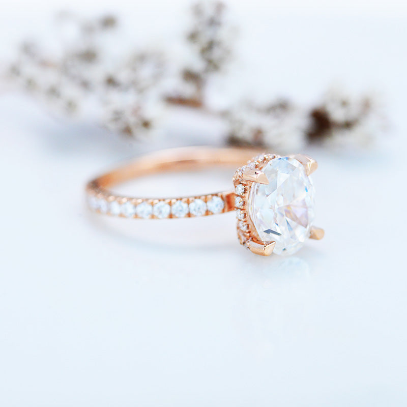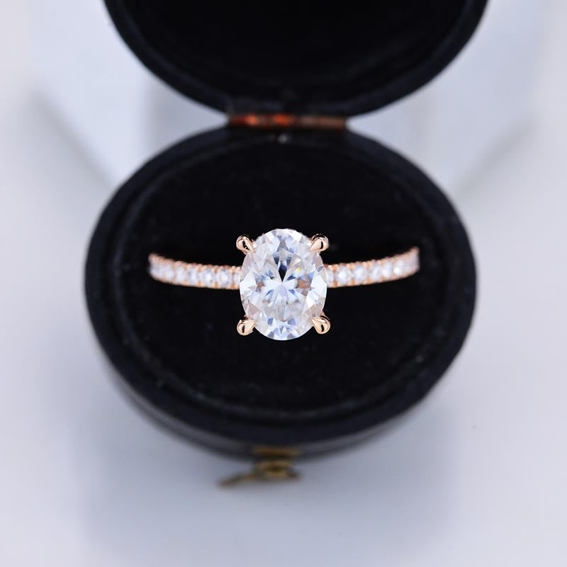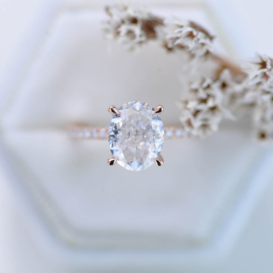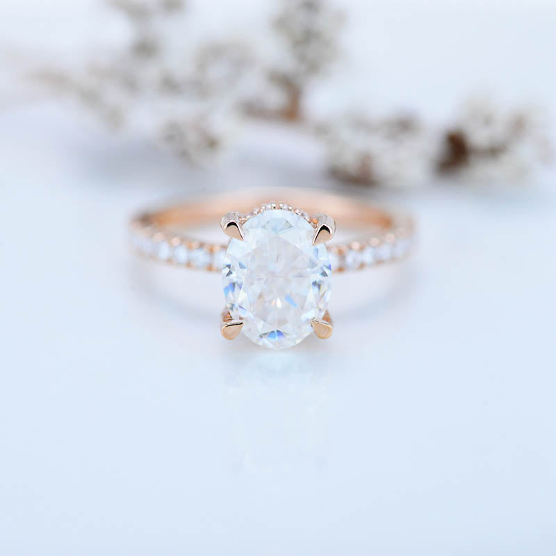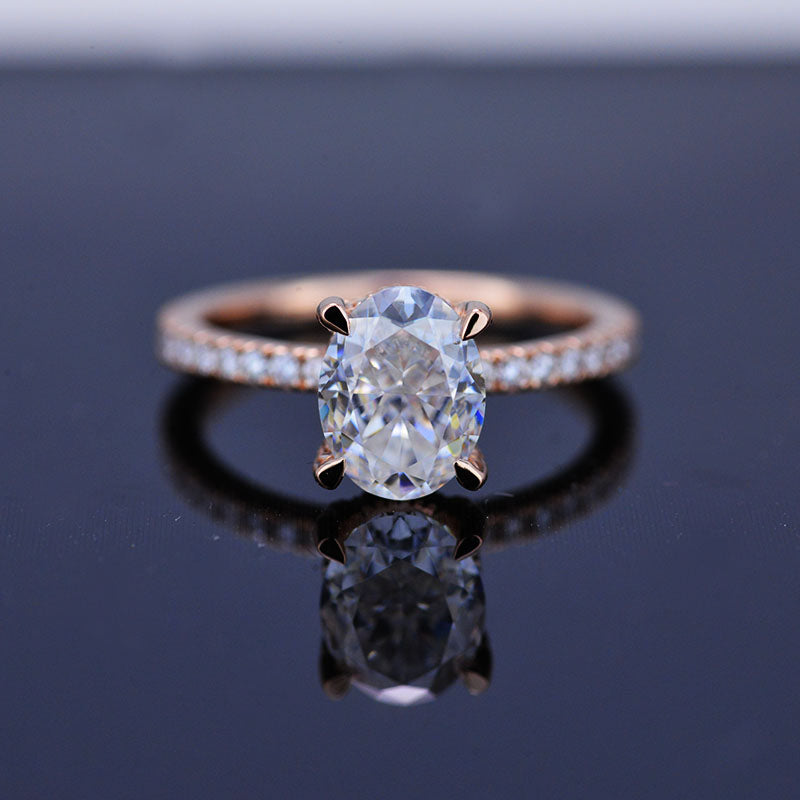 The default design option features 9x7mm Oval Crushed Ice Cut Giliarto Moissanite  Center Stone D-Colorless, VVS1-Clarity, VG-Cut, Ex-Polish, VG-Symmetry