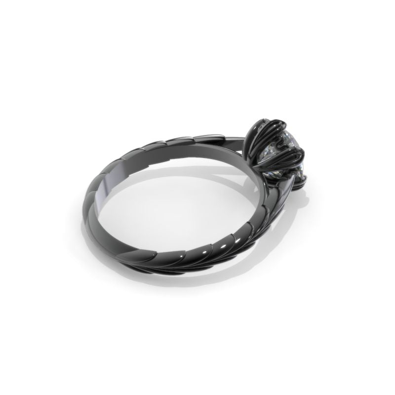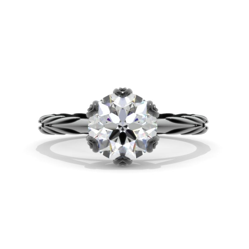 2.0 Carat Moissanite Center Stone (Round 8mm, D-Colorless VVS1-Clarity, Ex-Cut, Ex-Polish, VG-Symmetry) in 14K White/Black Gold Floral Engagement Ring.