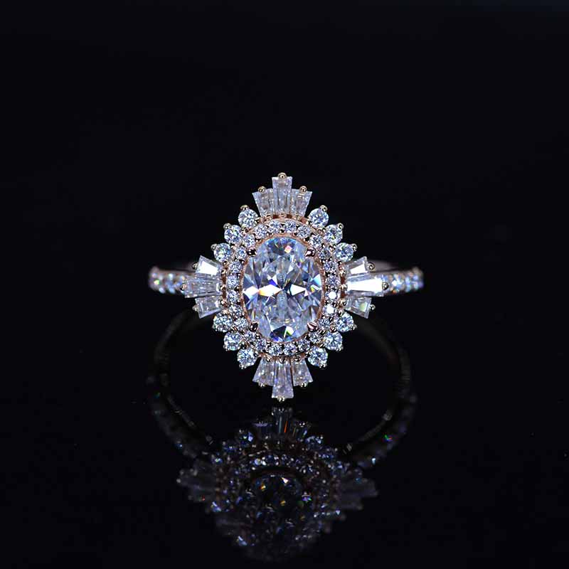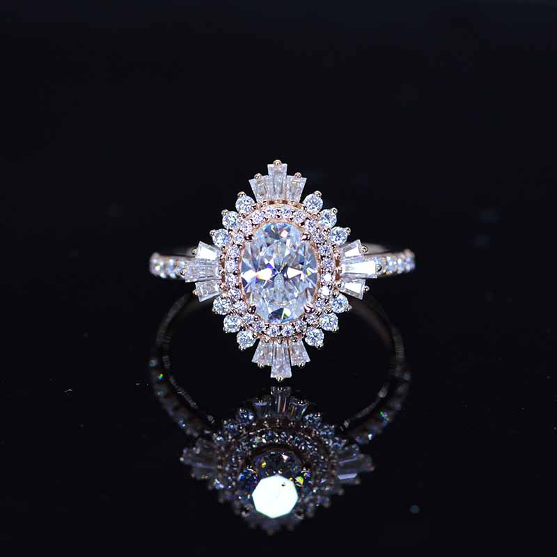 The default design option features 9x7mm Oval Giliarto Moissanite Center Stone D-Colorless, VVS1-Clarity, VG-Cut, Ex-Polish, VG-Symmetry
