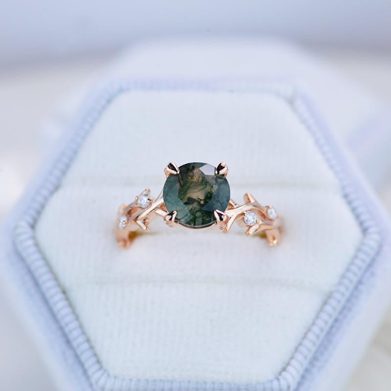 The default design option features 8mm Natural Moss Agate Center Stone, VG-Cut, Ex-Polish, VG-Symmetry