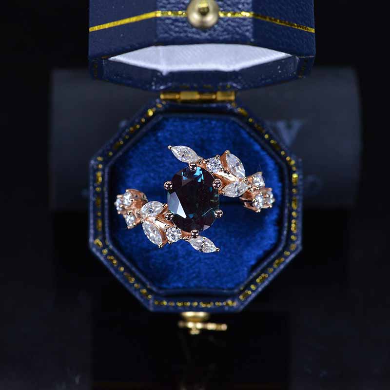 Engagement : 2 Carat Oval 9x7mm Ethically Lab-Grown Genuine Alexandrite  VVS1-Clarity, VG-Cut, Ex-Polish, VG-Symmetry Center Stone with 38 Colorless 1.5 CTW Moissanite