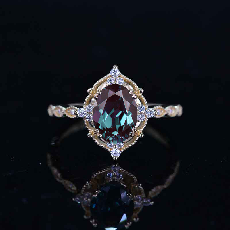 2 Carat Oval Alexandrite Halo Vintage Yellow Gold Engagement Ring - Giliarto