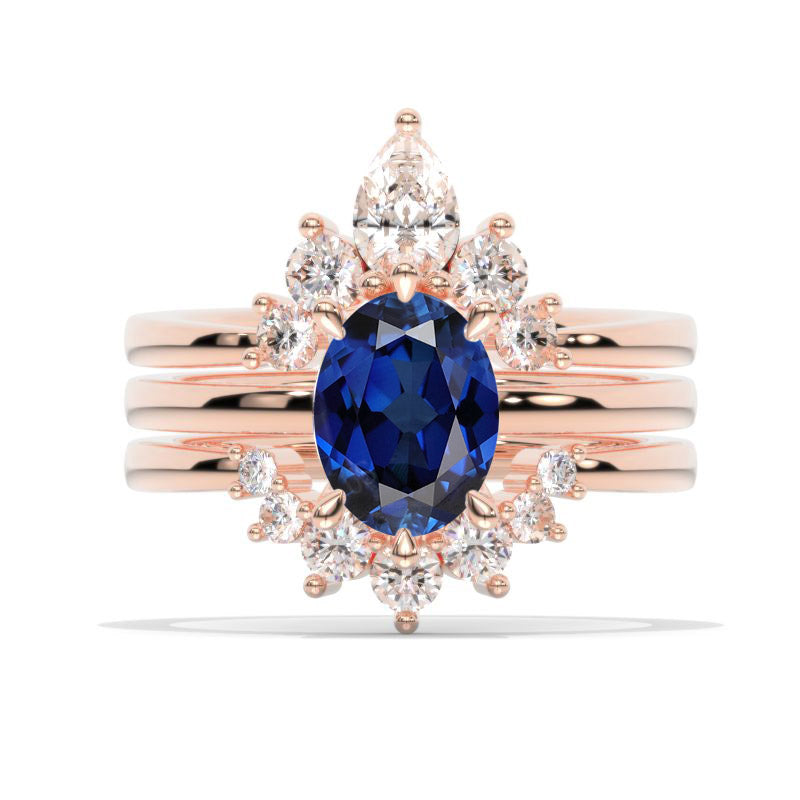 2 Carat Oval Blue Sapphire Engagement 14K White Gold Three Fairy Tail Ring Eternity Ring Set