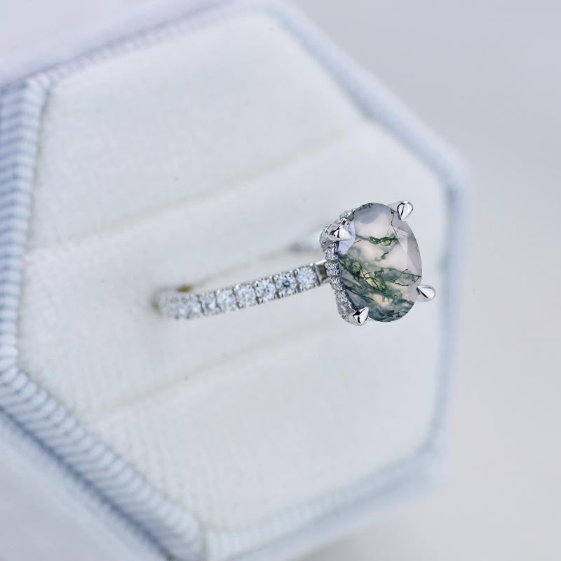 The default design option features Oval Cut 9x7mm Genuine Moss Agate Center StoneĀ VVS1-Clarity, VG-Cut, Ex-Polish, VG-Symmetry