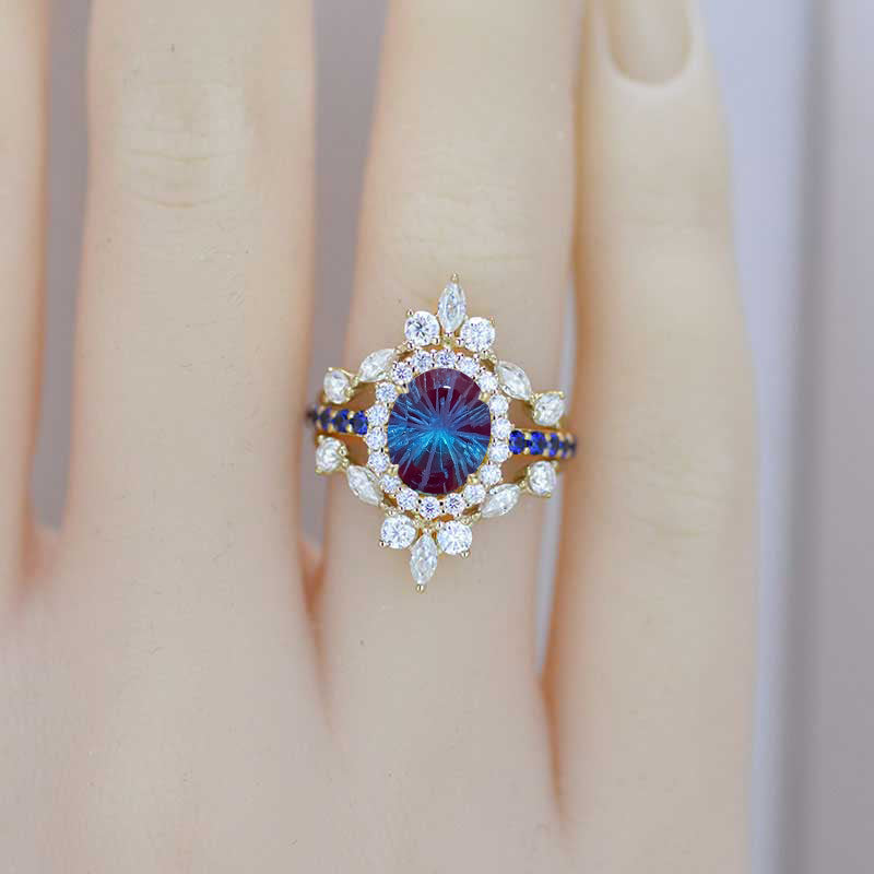 2 Carat Oval Fireworks Cut Alexandrite Diamond Sapphire Halo Engagement Gold Ring