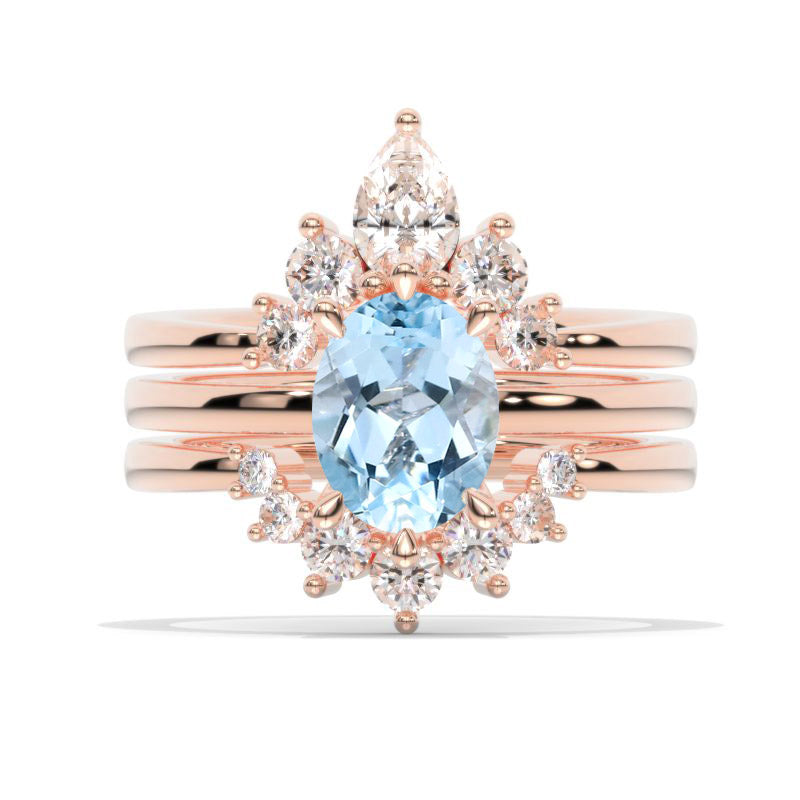 2 Carat Oval Genuine Aquamarine Engagement 14K White Gold Three Fairy Tail Ring Eternity Ring Set