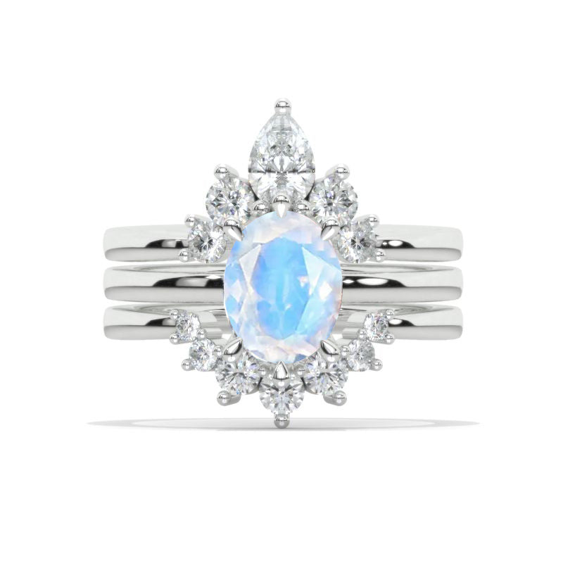 2 Carat Oval Genuine Moonstone Engagement 14K White Gold Three Fairy Tail Ring Eternity Ring Set