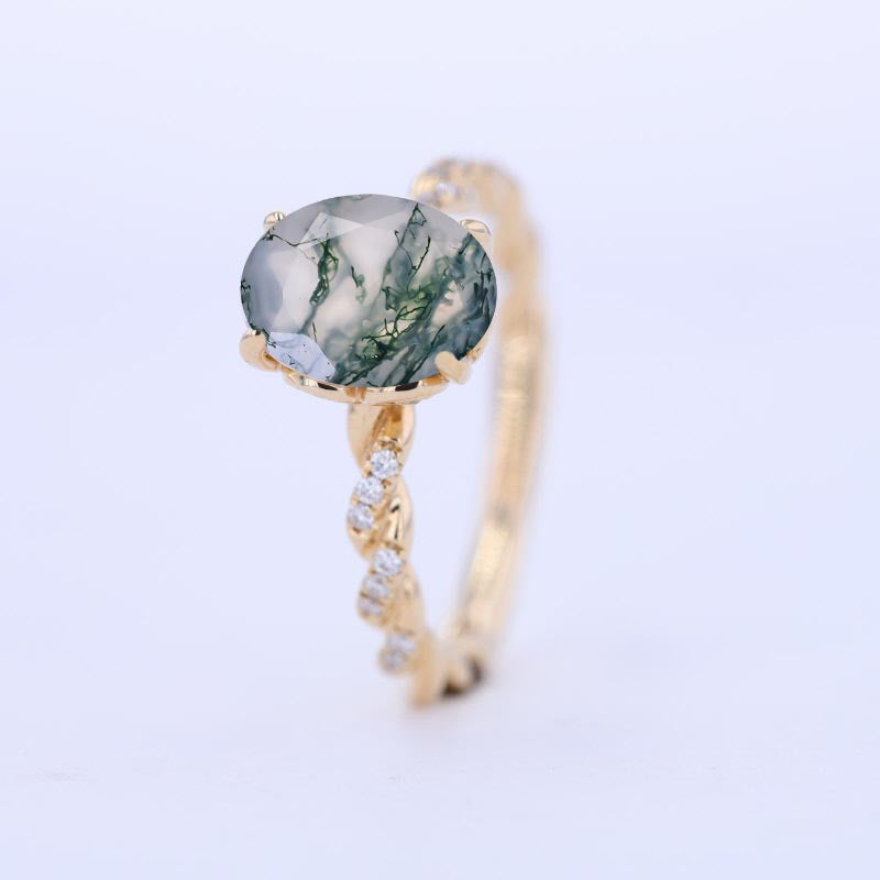 2 Carat Oval Genuine Moss Agate Hidden Halo Rose Gold Ring Twisted Sha - Giliarto